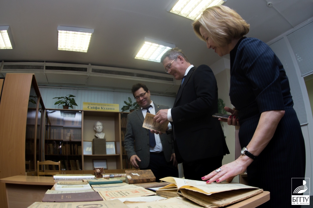 Глава республики обсудил с ректором потребность школ региона в учителях и современные методики преподавания башкирского языка, разработанные вузом, а также побывал в отделе редких книг.