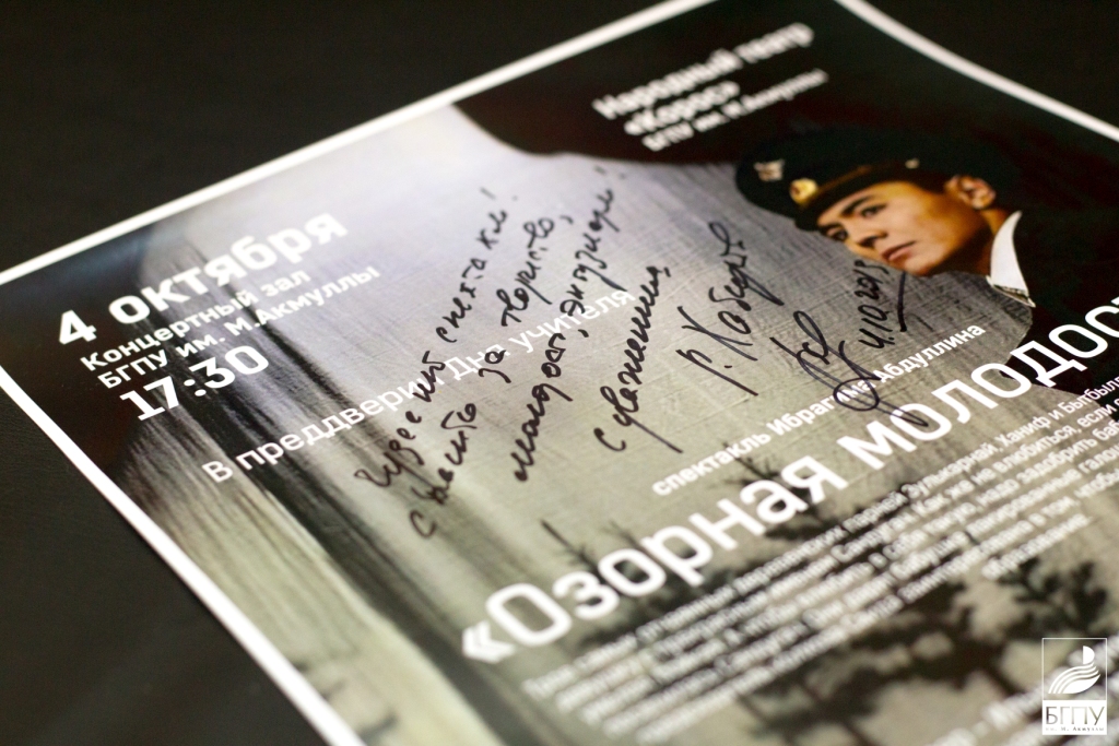После этого Радий Хабиров вместе с учителями, удостоенными сегодня государственных наград, посмотрел спектакль Народного театра «Ҡорос» БГПУ имени М. Акмуллы по пьесе башкирского писателя Ибрагима Абдуллина «Озорная молодость» («Тиле йәшлек»).
