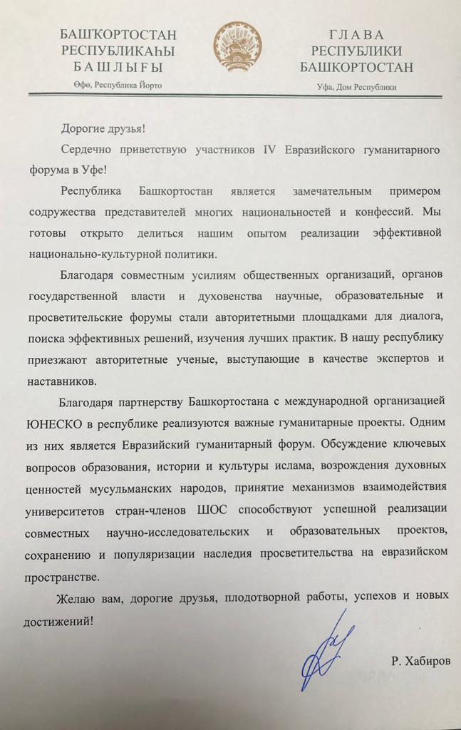 - В четвертый раз Уфа собирает со всего мира экспертов для обсуждения проблем гуманитарного знания и перспектив расширения международного сотрудничества в этой сфере. Нынешний форум посвящен просветительству, просвещению и образованию. Сегодня обсуждение главных проблем современного общества невозможно как без интеграции гуманитарного и естественно-научного знания, так и без объединения усилий всего мирового сообщества. Убежден, что на площадках форума мы сумеем обменяться теми тенденциями, которые присущи системе образования, просвещения и духовной сфере в целом, сможем наработать необходимые сегодня тренды для дальнейшего развития.