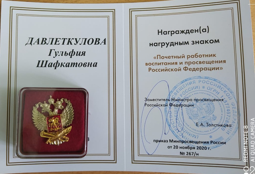 Поздравляем Г.Ш. Давлеткулову с присвоением нагрудного знака "Почетный работник воспитания и просвещения РФ"!