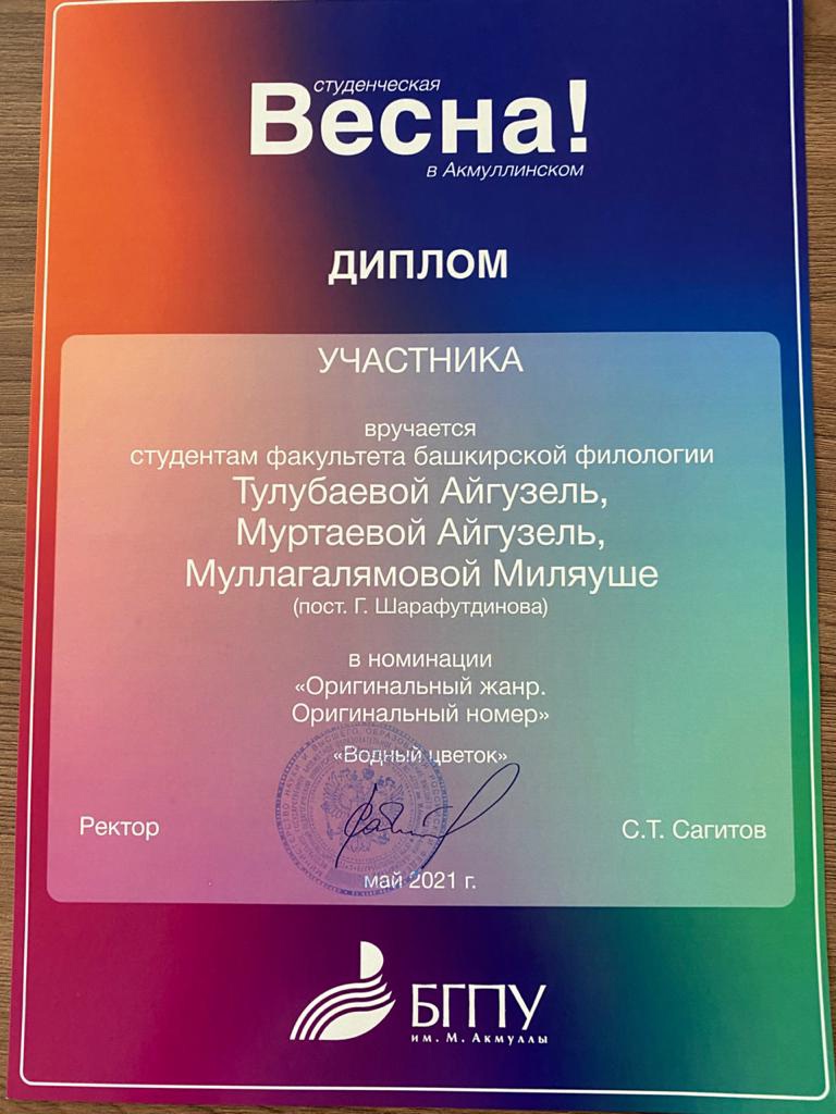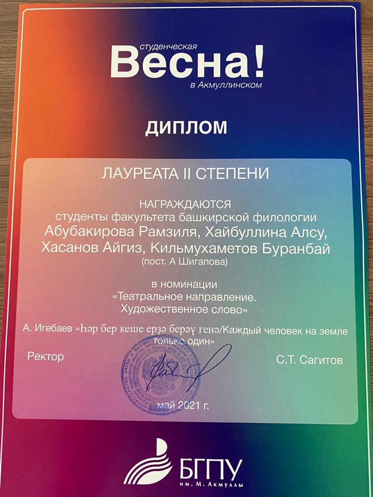 Факультет башкирской филологии стал лауреатами I степени "СтудВесны - 2021" БГПУ им. М. Акмуллы