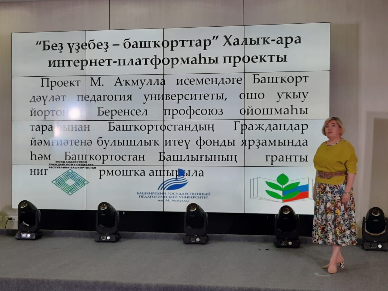 Проект Международной интернет-платформы «Беҙ үҙебеҙ — башҡорттар» («Мы сами — башкиры»), который реализуется Башкирским государственным педагогическим университетом им. М.Акмуллы и первичной профсоюзной организацией преподавателей и сотрудников университета, представила методист проекта, доцент кафедры башкирского языка и литературы Галина Г.Г. Она ознакомила телезрителей, участников презентации с целью и задачами проекта, со структурой платформы, с размещенными в ней материалами. Участники задавали интересующие их вопросы.