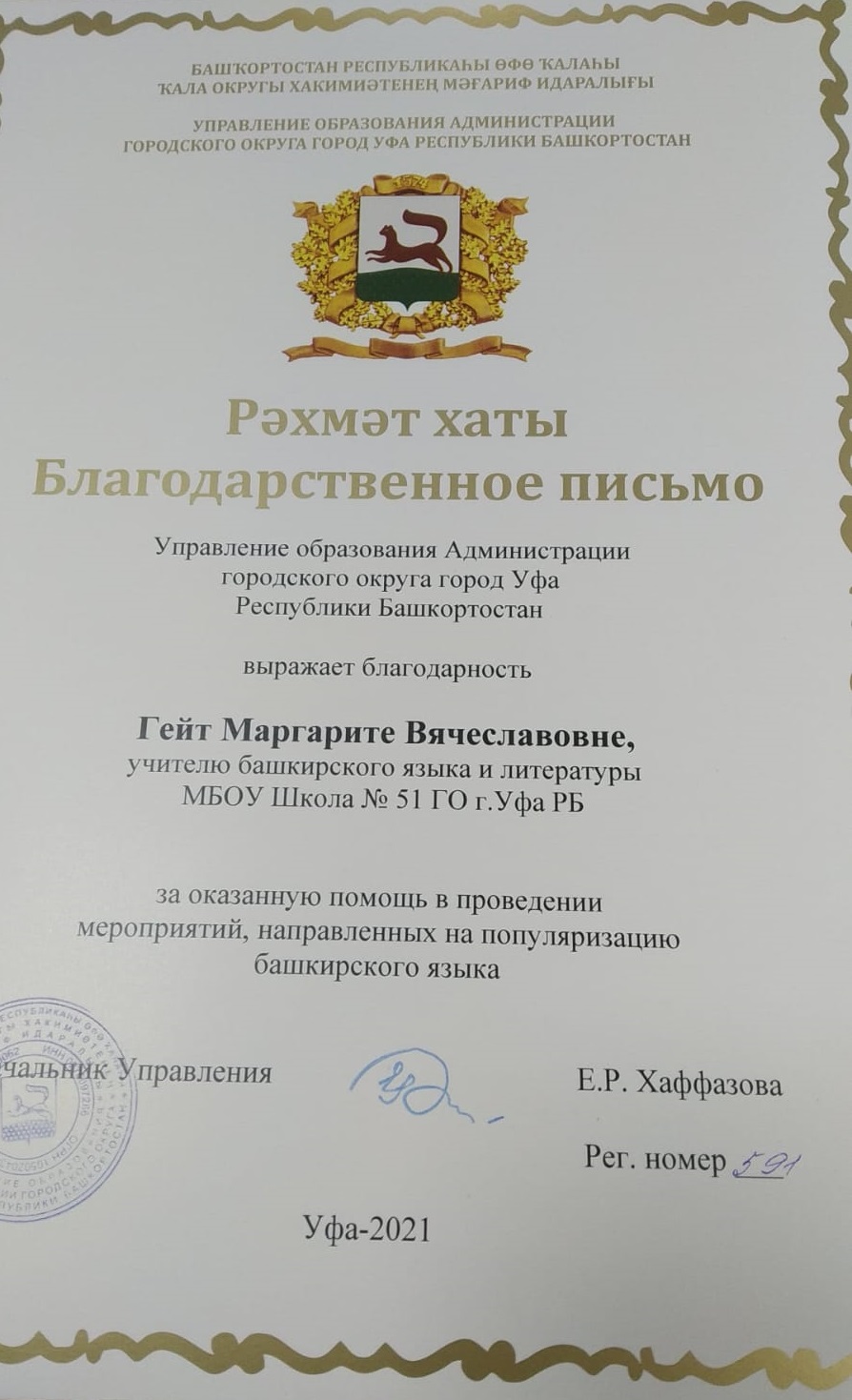 Студентка 5 курса башкирской филологии Гейт Маргарита, которая работает учителем башкирского языка в МБОУ № 51 г.Уфа ГО РБ, провела открытый урок в рамках мероприятий, посвященных Дню башкирского языка. Будучи студентом дневного отделения и при этом работая учителем не первый год, Маргарита продемонстрировала урок  в 5б классе  для зрителей телеканала БСТ. Она сама окончила русскую школу, поэтому ей знакомы трудности в  изучении башкирского языка. Поэтому каждый этап урока Маргарита Вячеславовна детально продумывает, тщательно составляет технологическую карту урока, как результат, ее уроки проходят интересно в виде игры, так как это эффективный способ подачи знаний, как уверяет она сама. В начале урока обучающиеся посмотрели мультфильм и определили тему урока - времена года. На открытом уроке дети не только читали и переводили текст, но и соревновались в быстроте с карточками, играли в мяч и рассказывали на башкирском языке о временах года, о своем времени года, и почему именно это время года их так привлекает. Ученица 5б класса Казарян Анна - армянка, несмотря на это, она очень хорошо говорит на башкирском. Анне нравится лето, потому что у нее день рождения, а вот Афонин Роман любит зиму, ведь можно поиграть в снежки!  Детям очень понравился урок, ученики отзываются: "На башкирском нам интересно, узнаем много нового и познавательного!" Это самая высокая оценка для учителя.