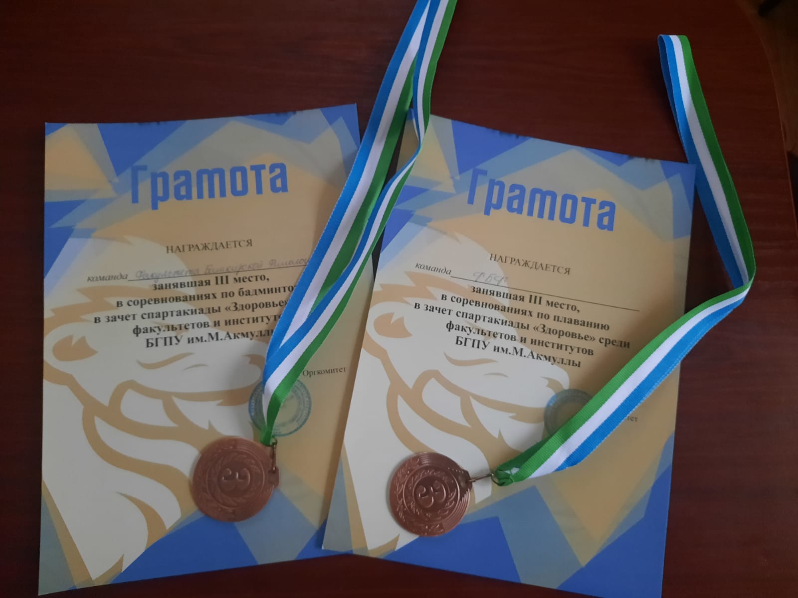 5 ноября в спортивном зале 2-го учебного корпуса БГПУ им. М. Акмуллы состоялись соревнования по 7 видам спорта среди преподавателей факультетов и институтов нашего вуза.  Данная спартакиада явилась подготовкой к межвузовской сартакиаде «Здоровье», которая пройдёт зимой. В сборную команду факультета башкирской филологии вошли: декан факультета Л.М. Хусаинова, доценты В.З. Тулумбаев, Г.Г. Галина, З.А. Хабибуллина, Г.Р. Шагапова, Г.М. Набиуллина, Р.А. Султакаева. Наша команда стала победителем дипломов 3 степени по бадминтону (Шагапова Г.Р., Набиуллина Г.М.) и плаванию (Хусаинова Л.М., Хабибуллина З.А., Тулумбаев В.З.). От всей души поздравляем наших спортсменов и пожелаем им новых спортивных достижений.