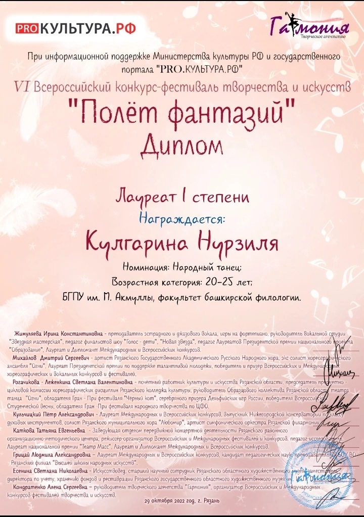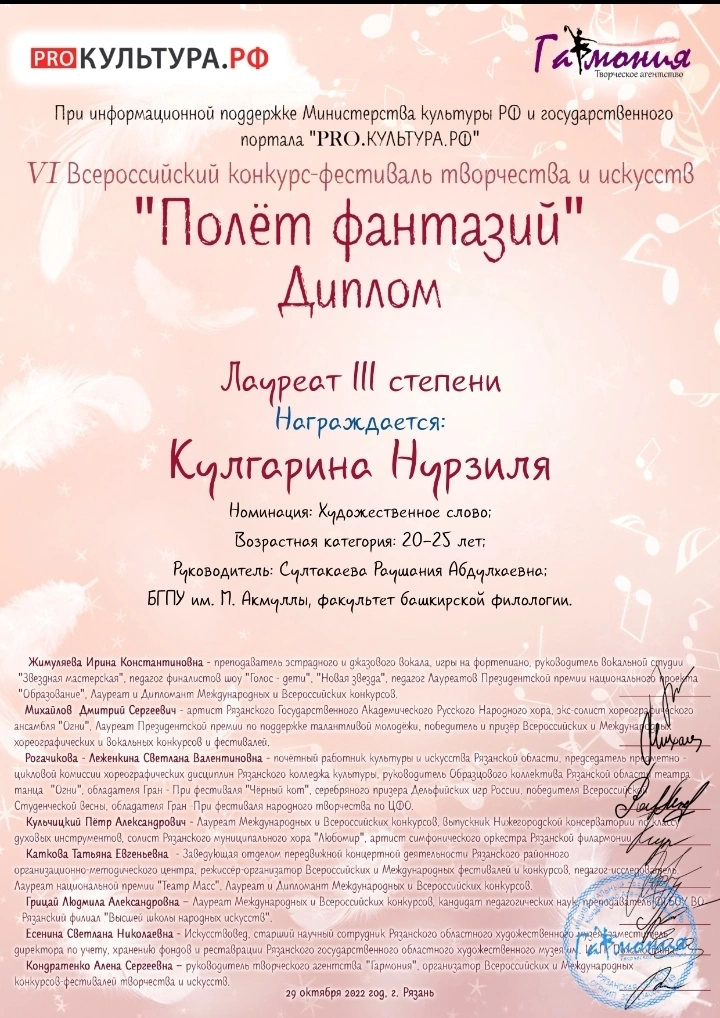 Поздравляем магистранта I курса факультета башкирской филологии – Кулгарину Нурзилю с отличными достижениями в VI Всероссийском конкурсе - фестивале творчества и искусства «Полет фантазий»