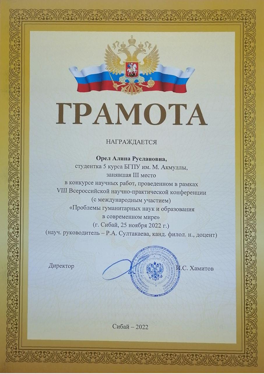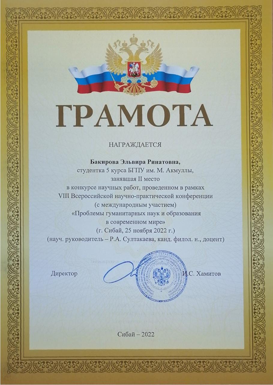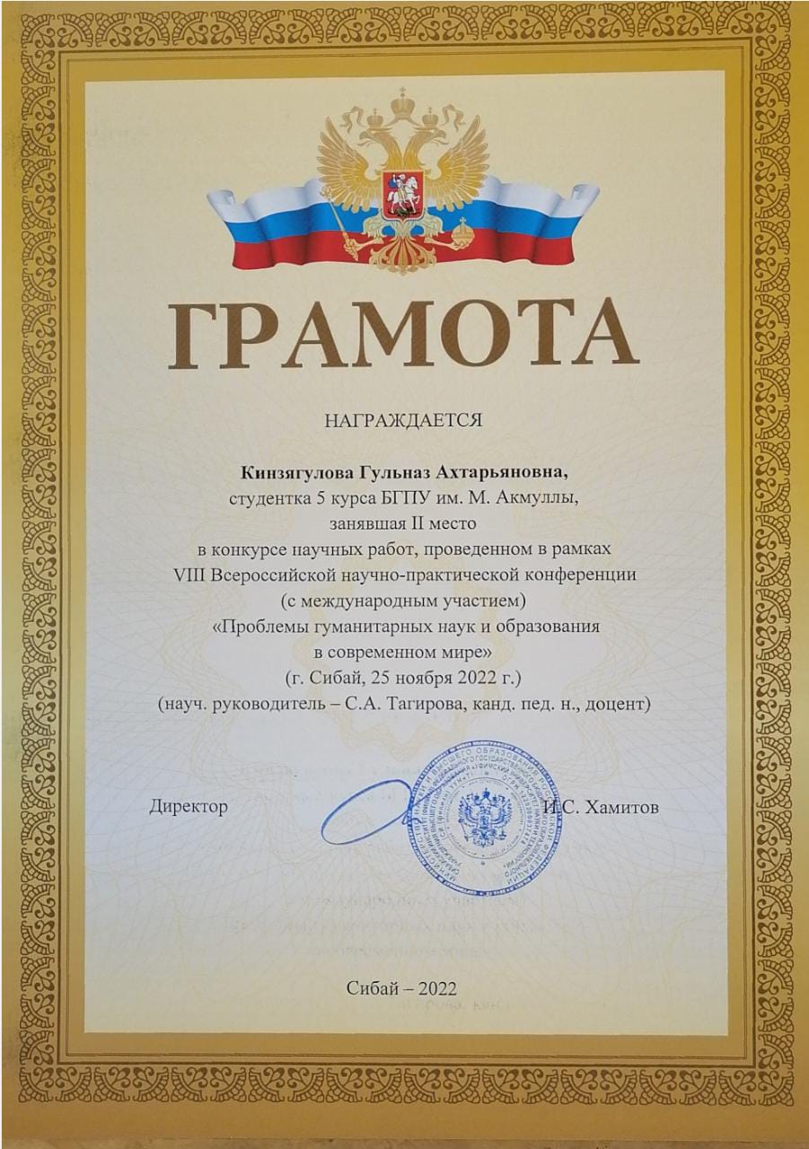 25 ноября 2022 г. в Сибайском институте (г. Сибай) Уфимского университета науки и технологии в оффлайн и онлайн форматах состоялась VIII Всероссийская научно-практическая  конференция (с международным участием)  «Проблемы гуманитарных наук и образования в современном мире». В рамках конференции  среди студентов и аспирантов проходил конкурс научных работ. Студенты V курса факультета башкирской филологии БГПУ им. М. Акмуллы стали победителями и награждены дипломами II степени – Кинзягулова Гульназ Ахтарьяновна (научный руководитель – С.А. Тагирова, к.пед. н., доцент кафедры башкирского языка и литературы ФБФ) и Бакирова Эльвира Ринатовна (научный руководитель – Р.А. Султакаева, к.филол. н., доцент кафедры башкирского языка и литературы ФБФ), III степени – Орел Алина Руслановна (научный руководитель – Р.А. Султакаева, к.филол. н., доцент кафедры башкирского языка и литературы ФБФ).