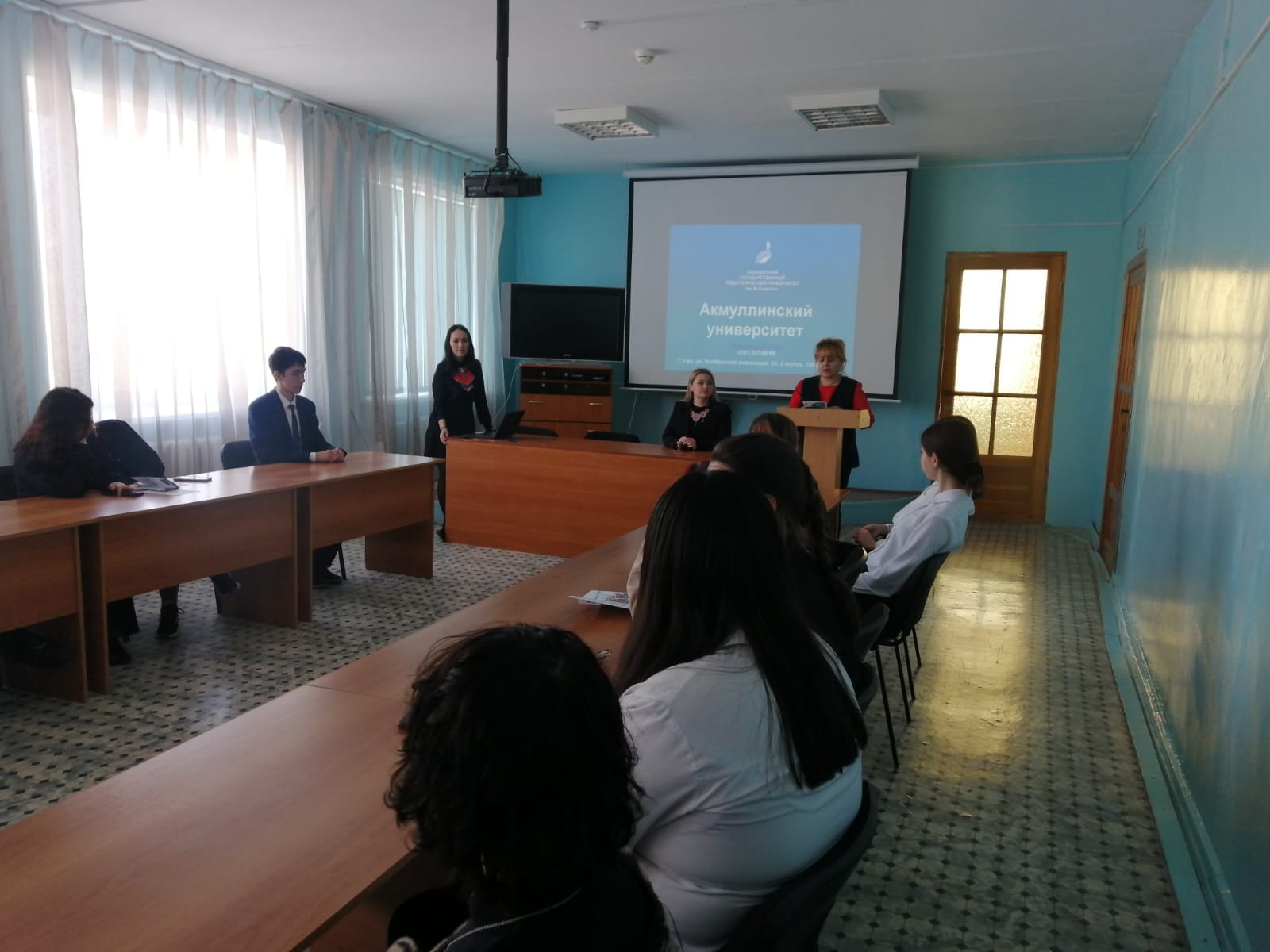 Старший преподаватель кафедры Давлеткулова Г.Ш. встретилась с обучающимися Баймакского лицея-интерната, ассистент кафедры Юлбарисов Л.Ф. познакомила школьников Лицея №4 г. Баймак с деятельностью БГПУ им. М.Акмуллы. К.ф.н., доцент кафедры Тулумбаев В.З. побывал в  Сибайском гимназии-интернате и в Школе №3 г. Баймака. К.ф.н., доцент Галина Г.Г. работала в Школе №2 г. Баймака. На встрече преподаватели отметили важность и необходимость получения высшего образования в БГПУ им М.Акмуллы. Было много сказано о факультетах, о направлениях подготовки представленных в ВУЗе и условиях обучения. Очень много интересного, с иллюстрацией соответствующего материала, было сказано о факультете башкирской филологи и т.д. Преподаватели предоставили информацию об изменениях в правилах приема в вузы в 2023 году, и формах обучения
