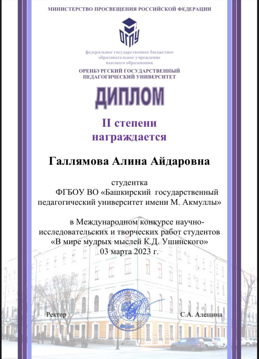 Студентка 2 курса факультета башкирской филологии – Галлямова Алина приняла участие в Международном конкурсе научно-исследовательских и творческих работ «В мире мудрых мыслей К. Д. Ушинского», где получила дипломом II степени.