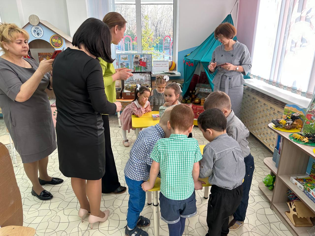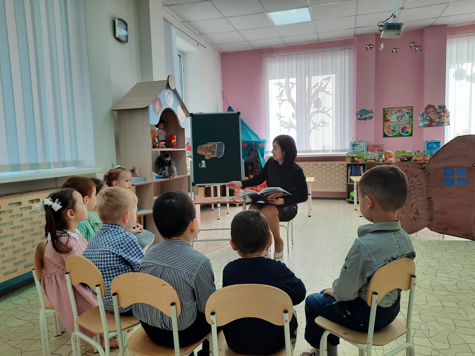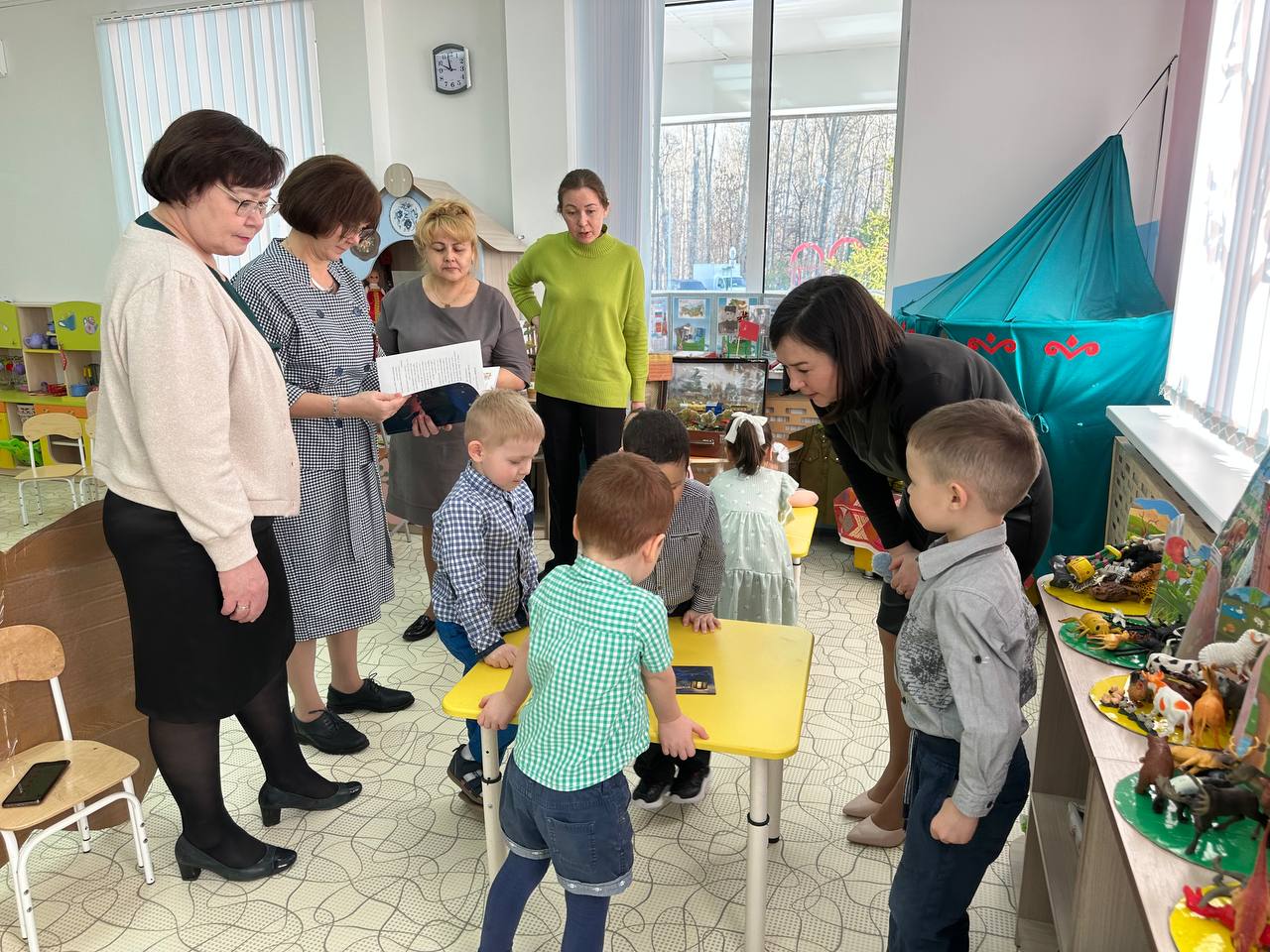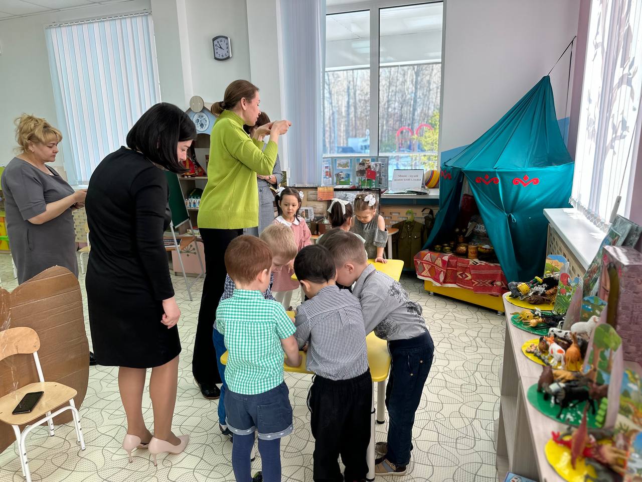 Дети во время занятия познакомились с народной сказкой, выучили новые слова на башкирском языке, поставили небольшую сценку по содержанию, в конце урока, разделившись на две команды, соревновались по сбору кубиков и пазлов.