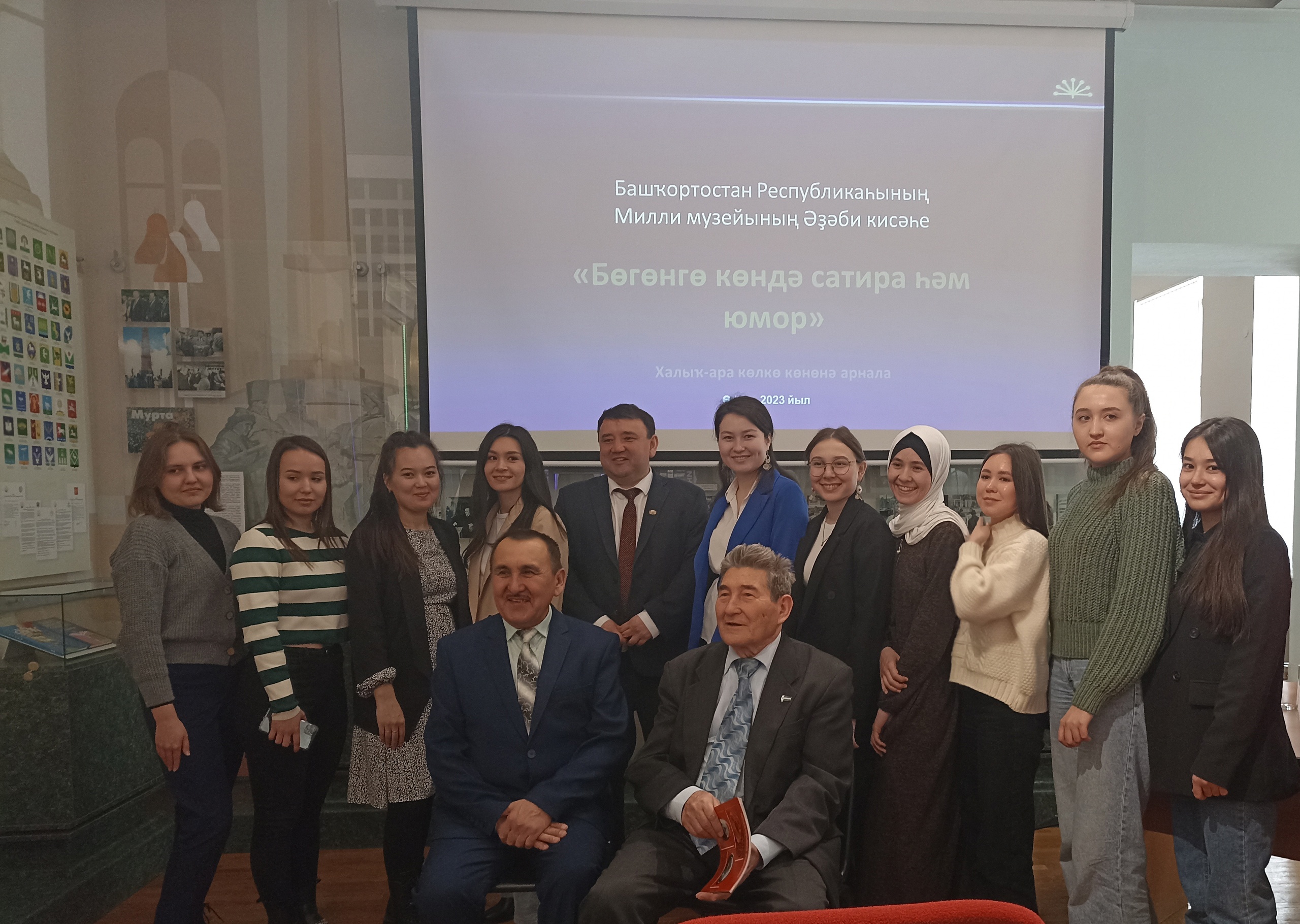 Перед студентами выступили писатель-сатирик, поэт Салимов Марсель Шайнурович и народный артист РБ Илимбетов Валит Халитович. Они рассказали о юморе и сатире в башкирской художественной литературе. Также  М. Салимов показал старые номера журнала сатиры и юмора «Хэнэк», В.Илимбетов прочитал стихи. Мероприятие прошло в веселой, дружественной атмосфере. По окончании встречи студенты задали интересующие их вопросы и посетили экспозиционные залы Национального музея РБ.
