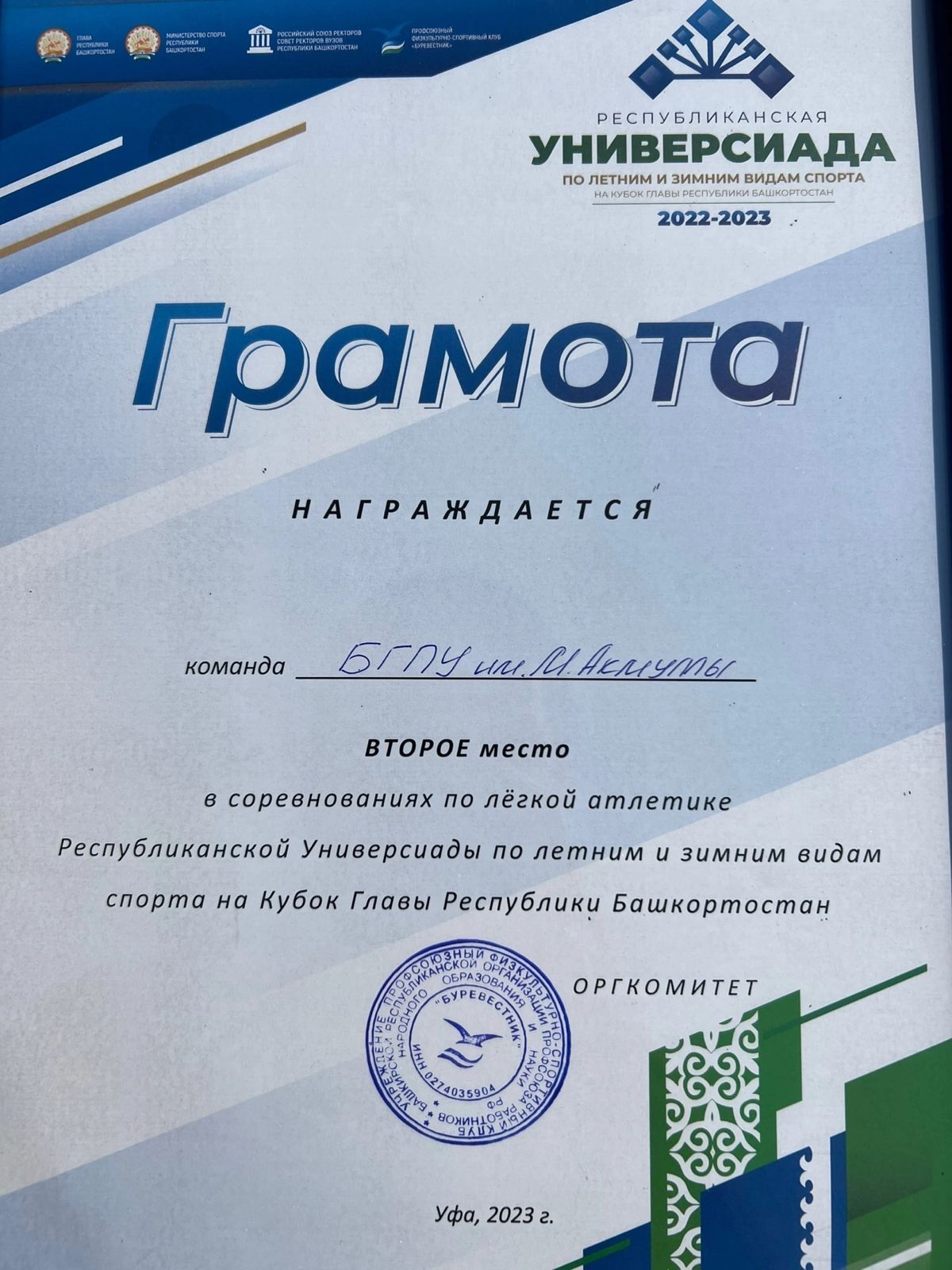 С 15 по 17 мая в г.Уфа на стадионе «ЦСП РБ имени Баталовой Р.A.» состоялись соревнования по легкой атлетике среди ВУЗов РБ. Сборная Акмуллинского университета заняла 2 место, где принял участие и студент факультета башкирской филологии - Шагбалов Илсен.