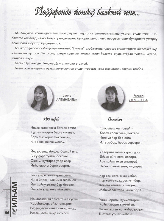 В республиканском молодежном журнале «Шоңҡар» опубликованы стихи членов литературно-творческого кружка «Тулҡын» факультета башкирской филологии Г.Биргановой, С.Кильмухаметовой, З.Алтынбаевой, Р.Ахметовой, К.Куватовой, А.Яубасаровой, А.Зиянбаева, А.Мухаметьяновой, И.Янбаевой, Э.Мухаметдиновой, А.Сулеймановой. В творчестве студентов отражаются тема любви, любви к родной земле и близким, тема малой родины, описывается красота родной природы, проблемы экологии. Темы добра и зла, смысл жизни – все они пропитывают стихотворения о философии, которые можно встретить в творчестве некоторых студентов. Желаем творческих успехов, вдохновения членам литературно-творческого кружка «Тулҡын»!