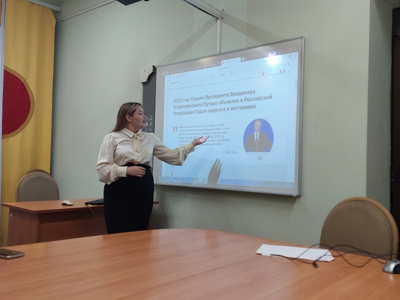 На внеурочном занятии говорили о понимании социальной значимости профессии учителя и уважения к ней, чувстве благодарности своим учителям и наставникам, стремлении к достижению высоких результатов в своей будущей профессии и специальности, потребности в передаче опыта следующим поколениям.