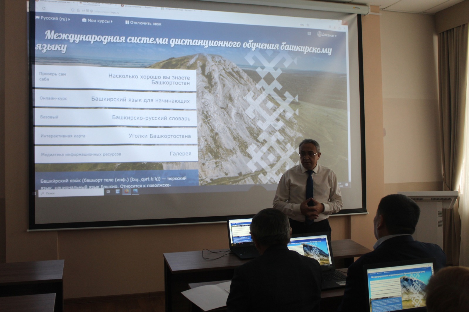 26 октября гости посетили факультет башкирской филологии. Доцент кафедры башкирского языка и литературы В.З. Тулумбаев презентовал проект «Международная система дистанционного обучения башкирскому языку», доцент кафедры башкирского языка и литературы Г.Р. Шагапова рассказала о факультативном курсе «Акмулловедение», показала сайт «Мы сами башкиры». Старший преподаватель кафедры башкирского языка и литературы Г.Ш. Давлеткулова ознакомила гостей с учебно-методическими комплексами, разработанными преподавателями факультета башкирской филологии.