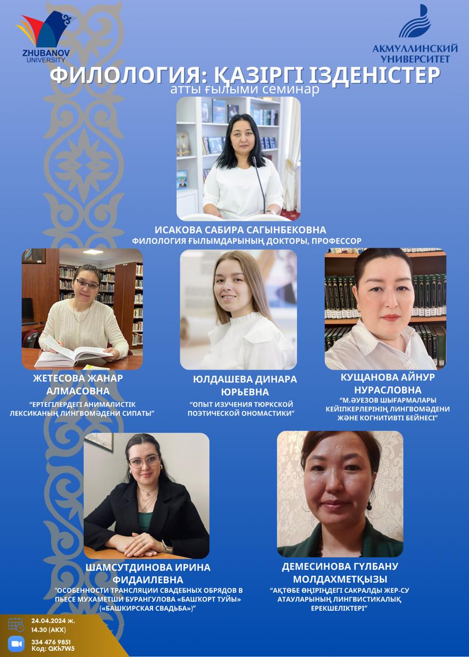 24 апреля 2024 г. был организован Международный научный семинар «Филология: Қазiргi iзденiстер», в котором приняли участие аспиранты и докторанты Акмуллинского университета и Актюбинского регионального университета им. К. Жубанова (г. Актобе, Казахстан).