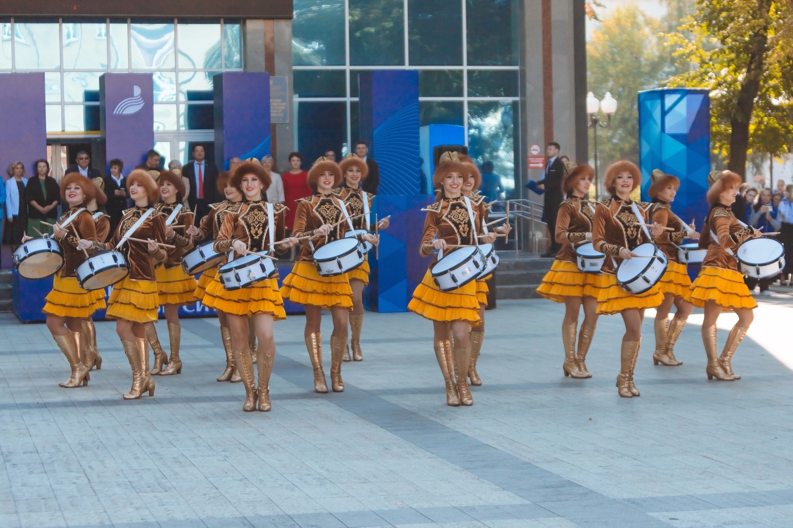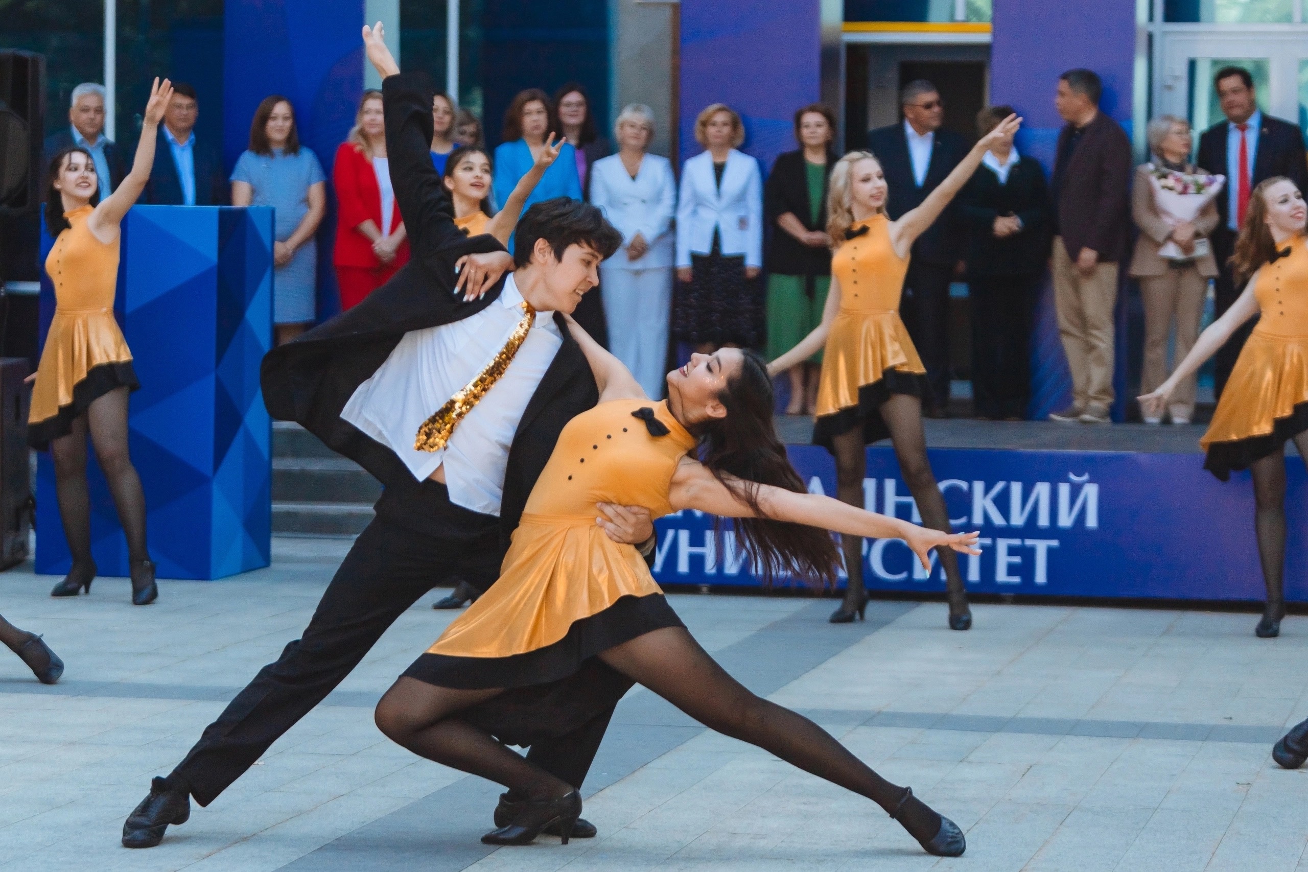 Сопровождалась торжественная линейка творческими номерами народного ансамбля «Кружева» и «Грация», спортивно-аэробического шоу «Страдл», коллектива барабанщиц и мажореток «Держава», хора «Кантанте», вокальной службы Акмуллинского «Голос» и студенческого танцевального объединения «Движение».
