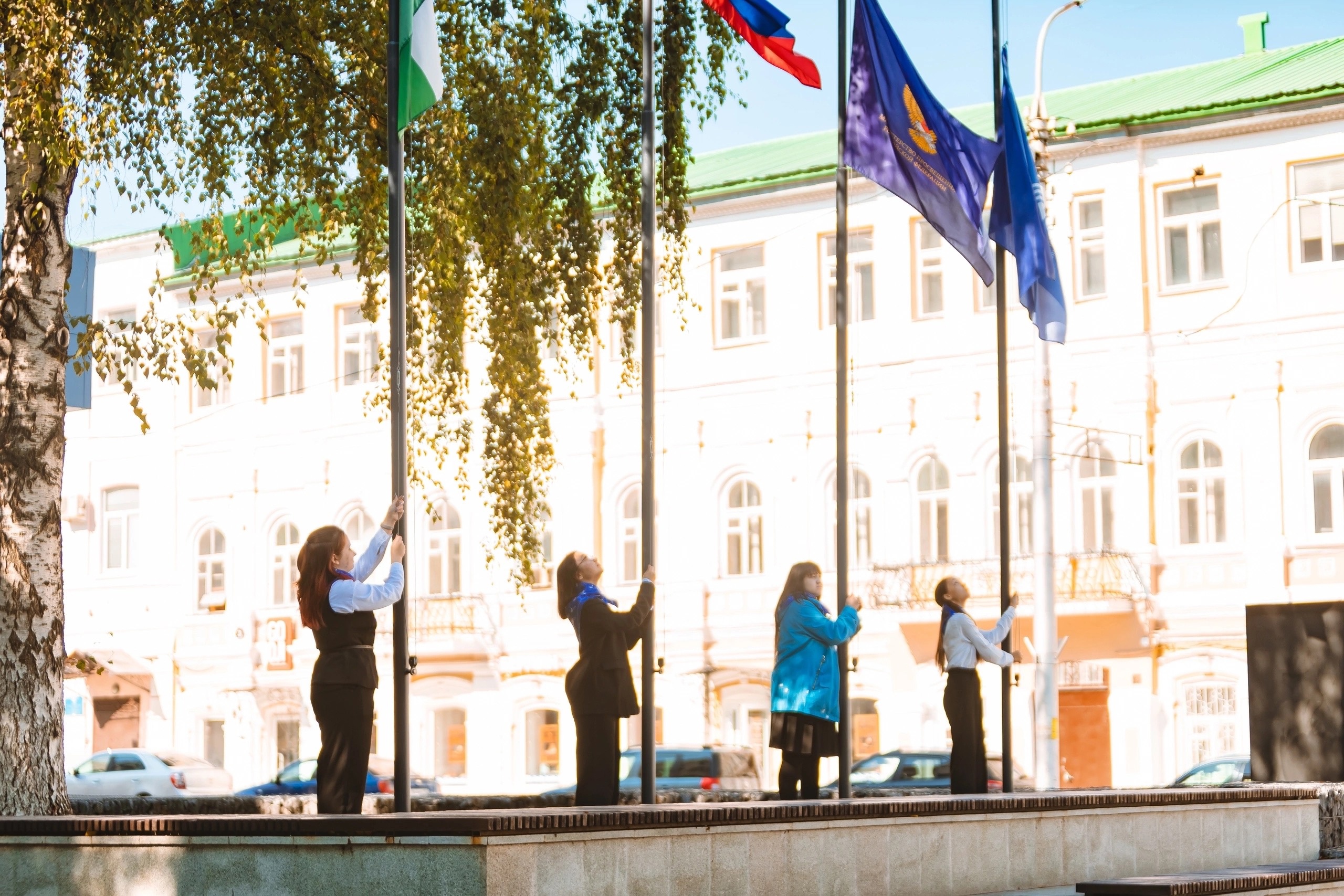 Начало торжества было ознаменовано поднятием флагов Российской Федерации, Республики Башкортостан, Акмуллинского университета и Министерства просвещения России. Почетное право первыми в этом учебном году поднять флаги получили студентки первого курса – победители Акмуллинской олимпиады, среди которых были студенты факультета башкирской филологии Айгиза Идрисова и Марьяна Хусаинова.