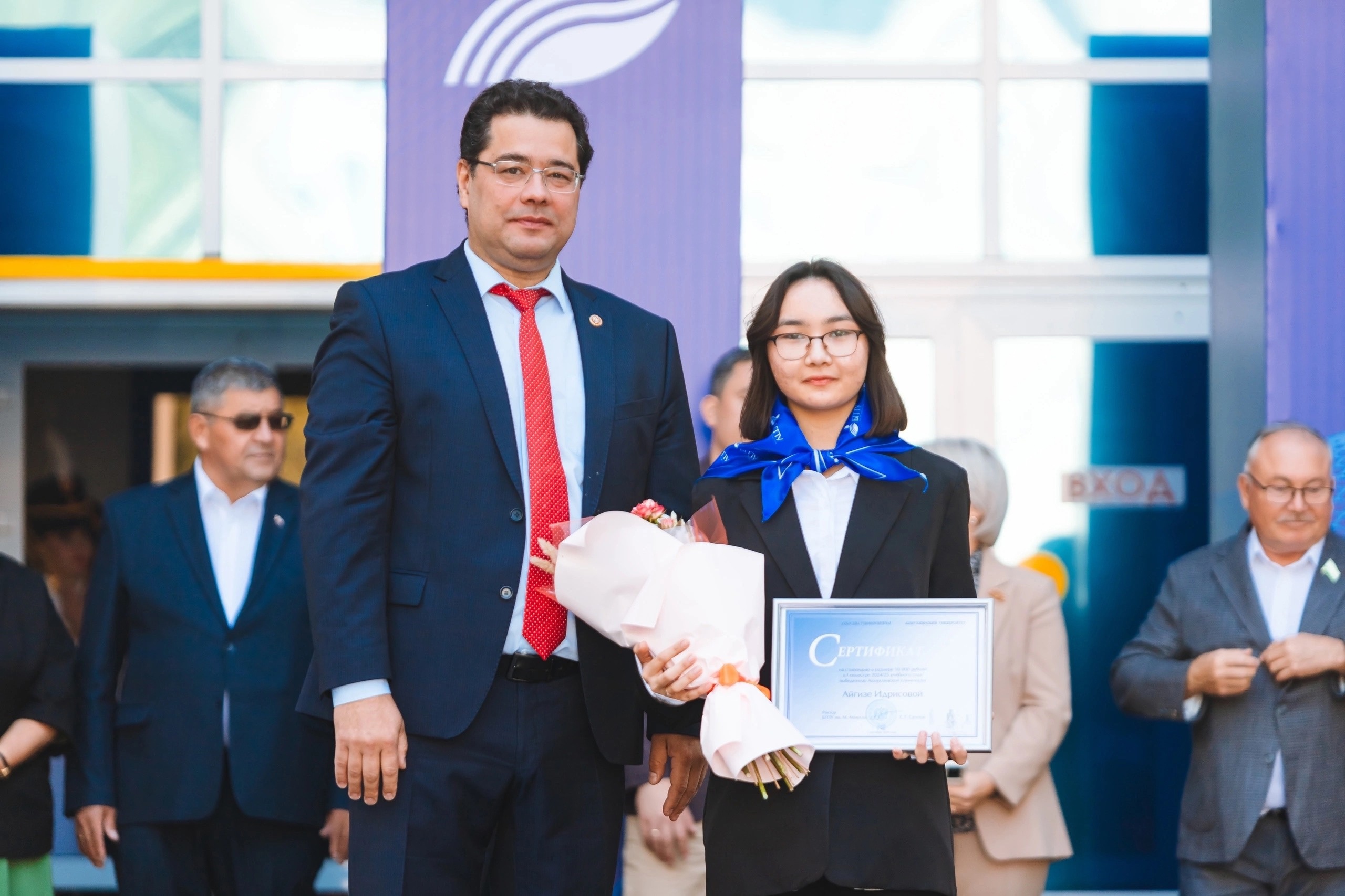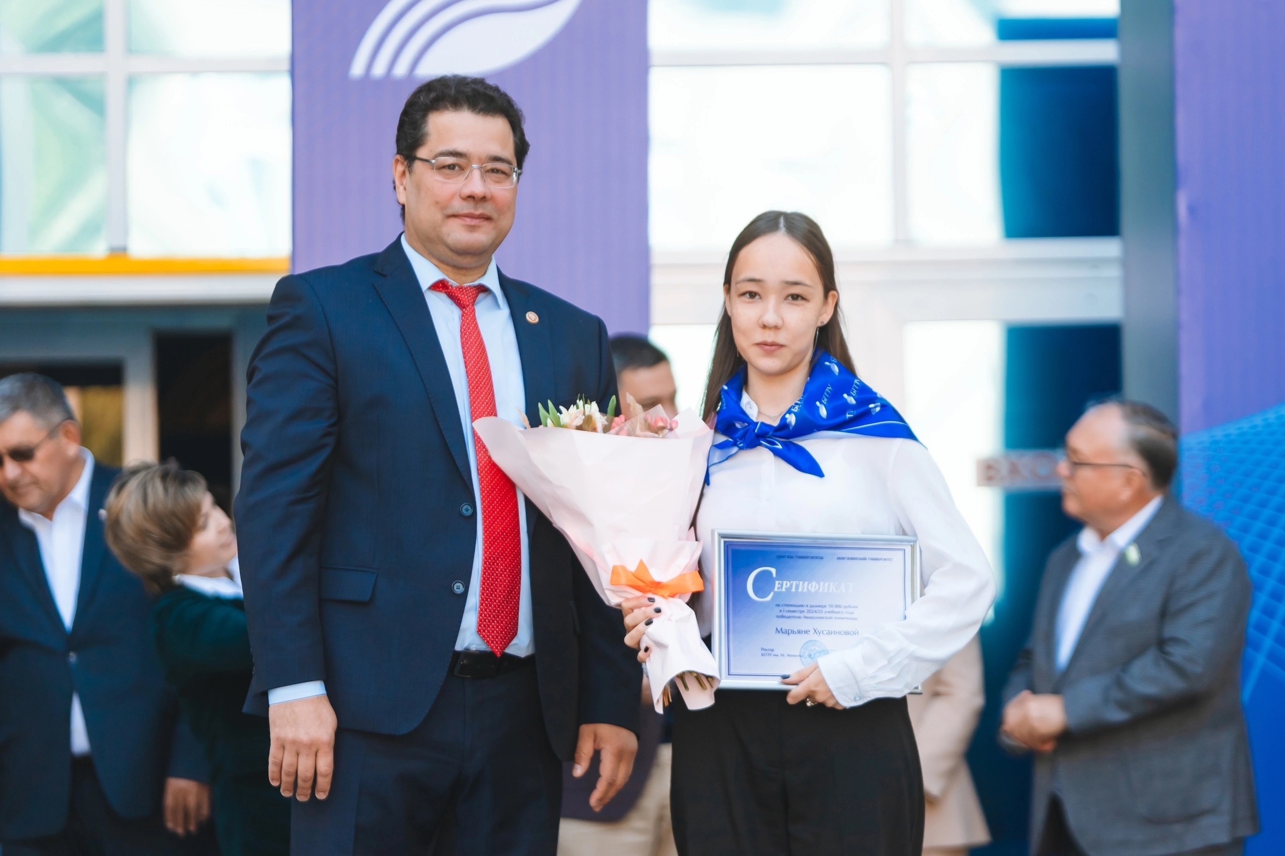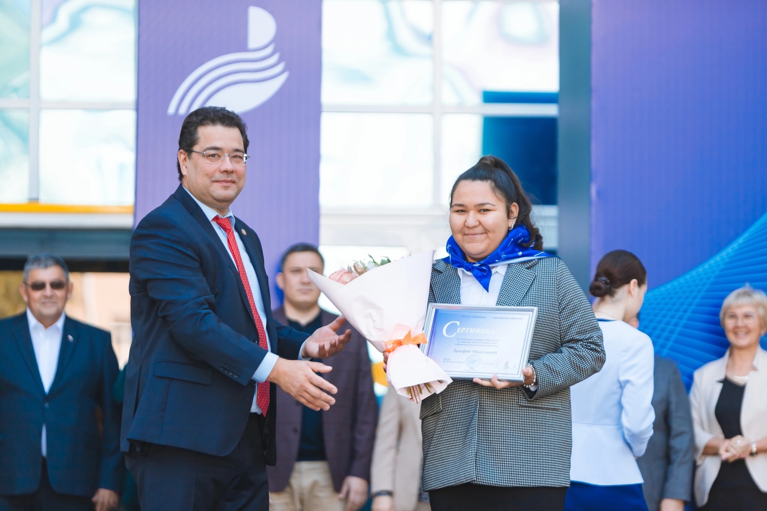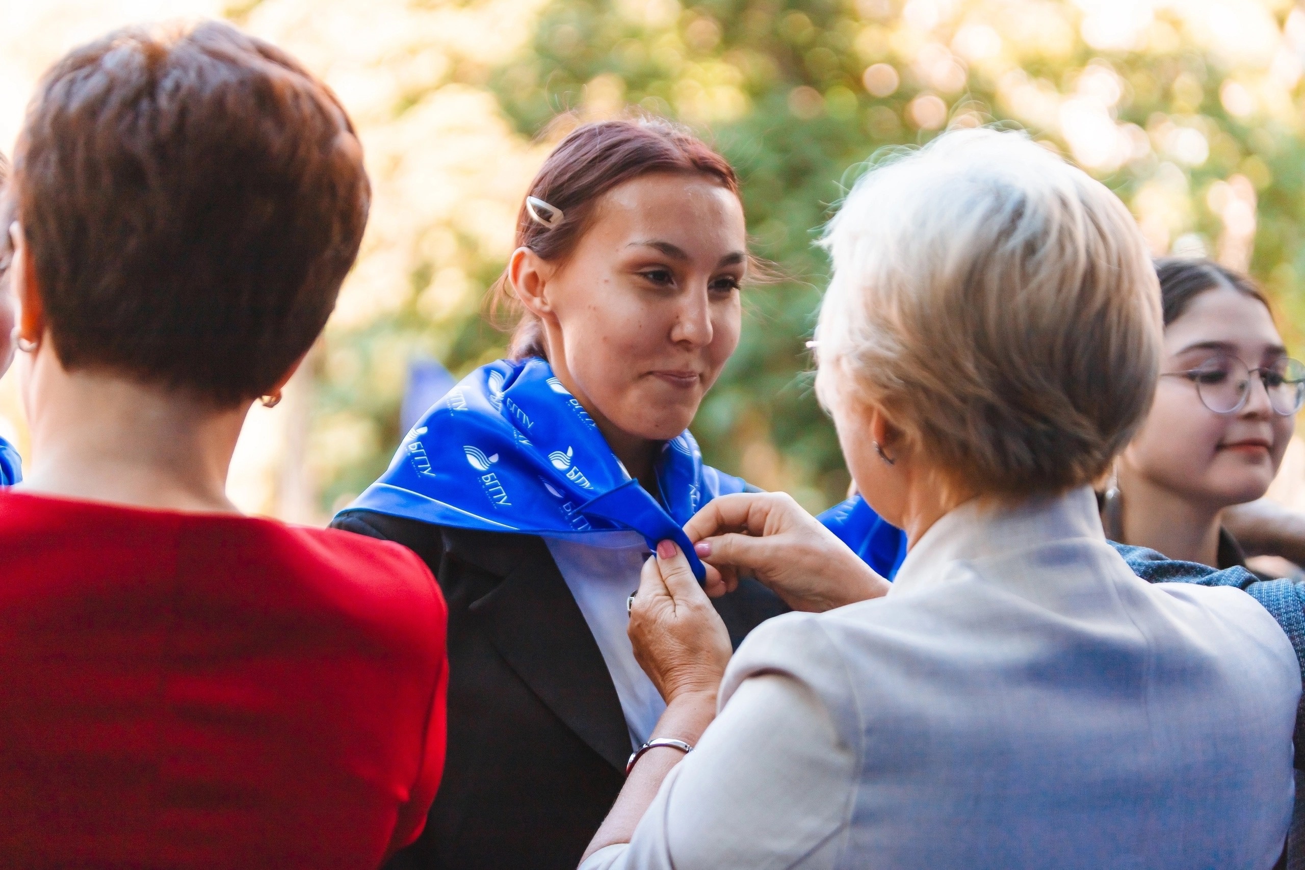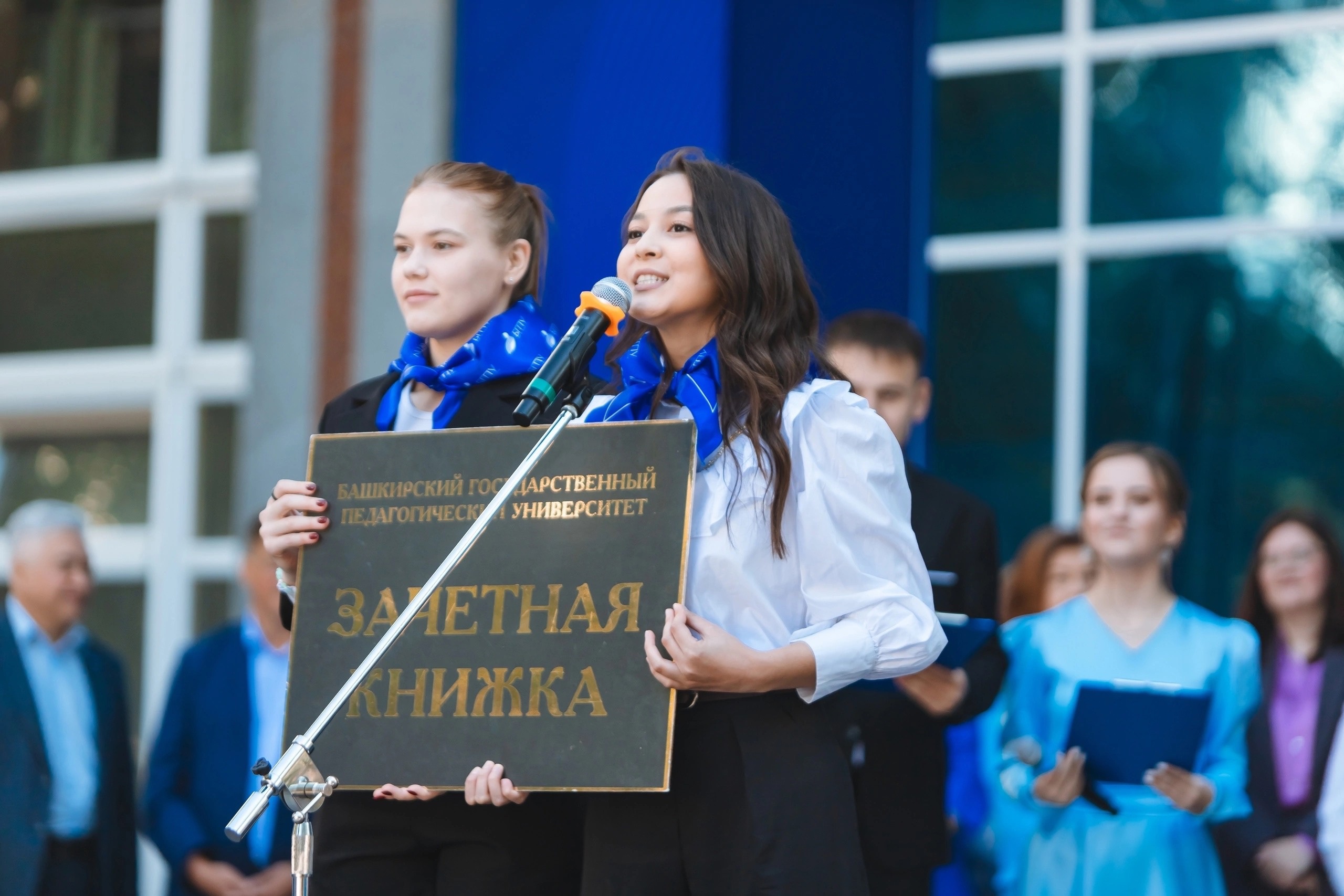По традиции, принимая новичков в семью Акмуллинского университета, представители профессорско-преподавательского корпуса повязали первокурсникам галстуки с отличительным знаком университета.