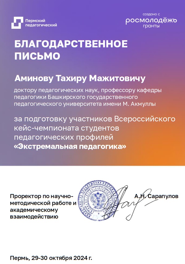 29-30 октября состоялся Всероссийский кейс-чемпионат "Экстремальная педагогика", организованный Пермским государственным гуманитарно-педагогическим университетом, в котором приняла участие студентка третьего курса факультета башкирской филологии Султанова Назгуль. Мероприятие собрало участников из различных уголков страны, включая Волгоград, Пермь, Южно-Сахалинск, Саратов, Глазов и многие другие города.