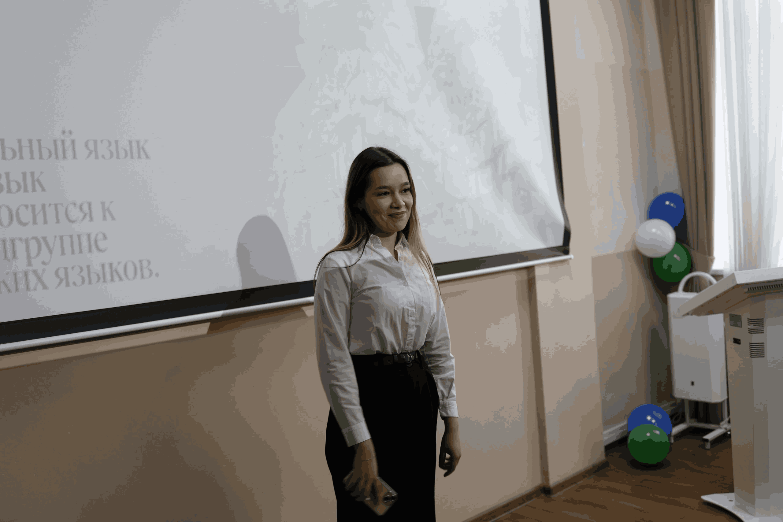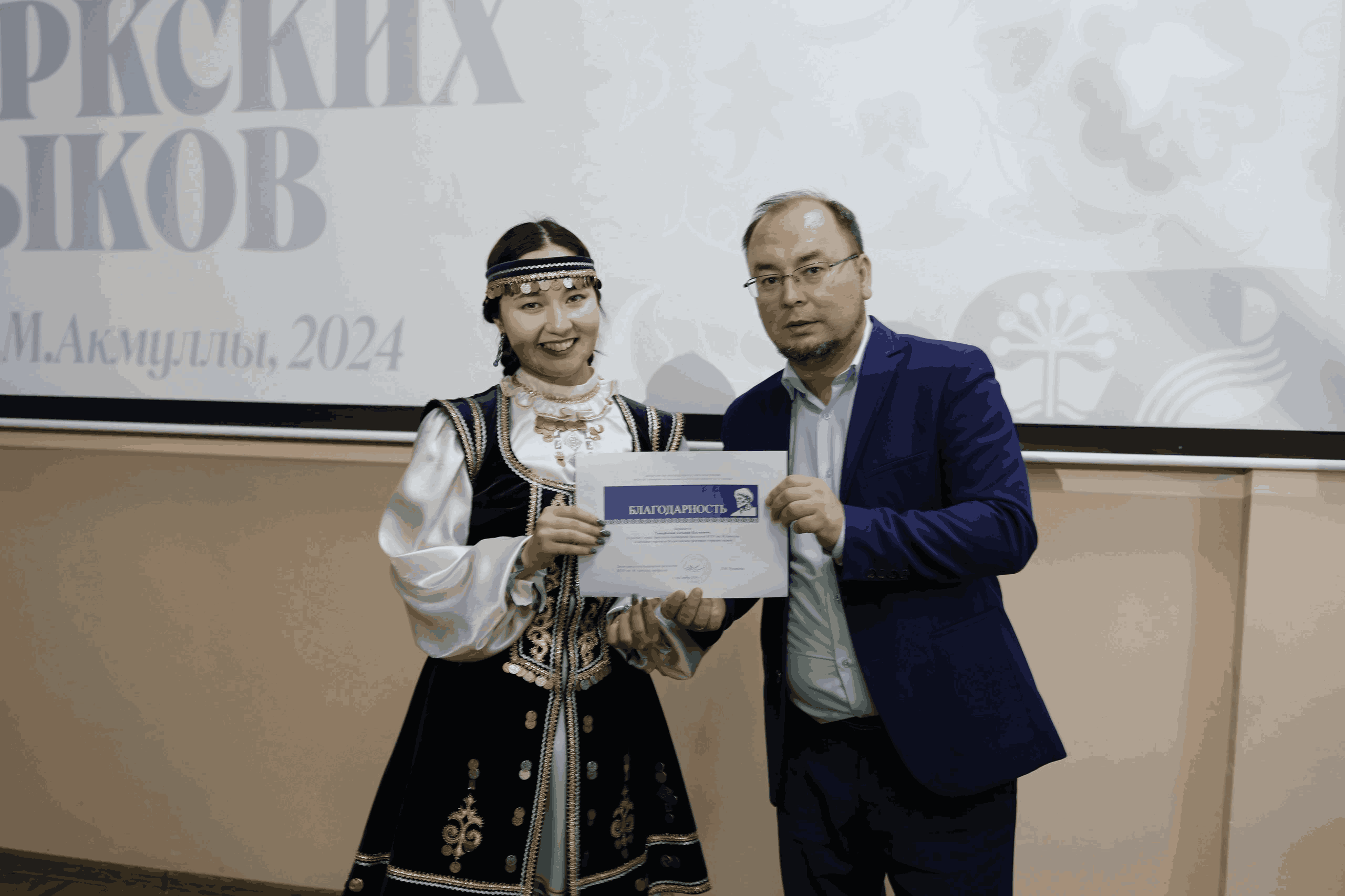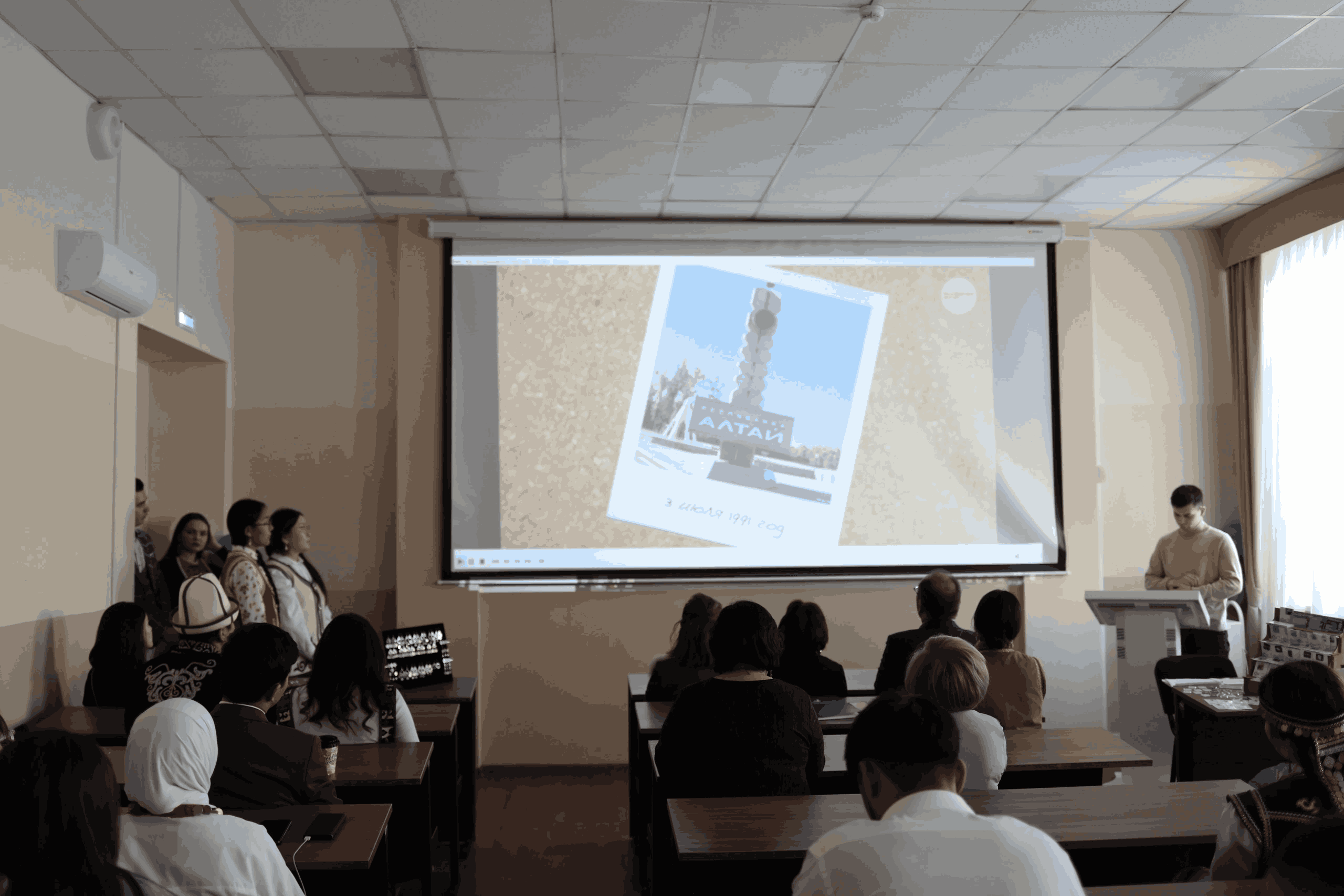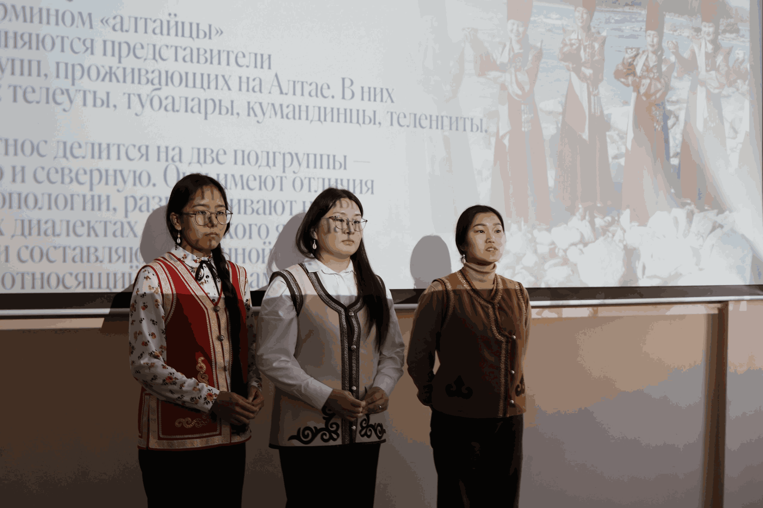 Не менее ярким представителем родства с тюркским народом является Алтайский язык и его носители. Алтай – место силы и любви. В культуре алтайских народов особое место занимает сам Алтай. Для них он - главный источник благополучия, силы и красоты. Именно Алтай, а точнее его дух, даёт алтайцам пищу, одежду, кров, счастье и даже жизнь. Если алтайца спросить "кто твой бог?", он ответит, мой бог - камень, дерево, природа, Алтай. Среди приглашенных гостей были представители Алтайского народа – студенты Горно-Алтайского Государственного университета, проходящие на данный момент в Акмуллинском университете на базе нашего факультета  стажировку. Енчинова Кюнел, Мекечинова Александра, Толкочокова Эмилия не только показали небольшое вводное видео о своем народе, но и спели народную песню, где нашли свое отражение живописные горные просторы Алтая, его величественная и живописная природа. Исполнение было настолько проникновенным, что оно вызывало трепет и восторг у зрителей, напоминая о важности сохранения культурного наследия!