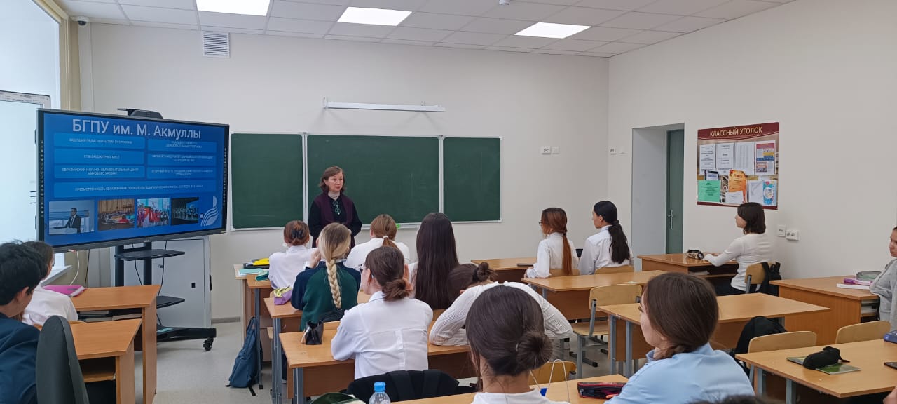 17 декабря в рамках профориентационной работы доцент кафедры тюркской и восточной филологии факультета Гулькай Рахимьяновна Шагапова провела встречу с учащимися 10 и 11 классов гимназии им. Гали Сокороя и МБОУ СОШ № 2 с.Верхние Татышлы в Татышлинском районе. На встрече Г.Р. Шагапова рассказала о структуре и направлениях работы кафедры, подчеркнув важность изучения башкирских, тюркских и восточных языков, объяснила правила и условия поступления на факультет башкирской филологии, о формах поддержки студентов в университете и мерах социальной помощи. Гулькай Шагапова отметила, что выпускники факультета имеют возможность работать в различных сферах, включая образование, культуру и государственную службу и др.
