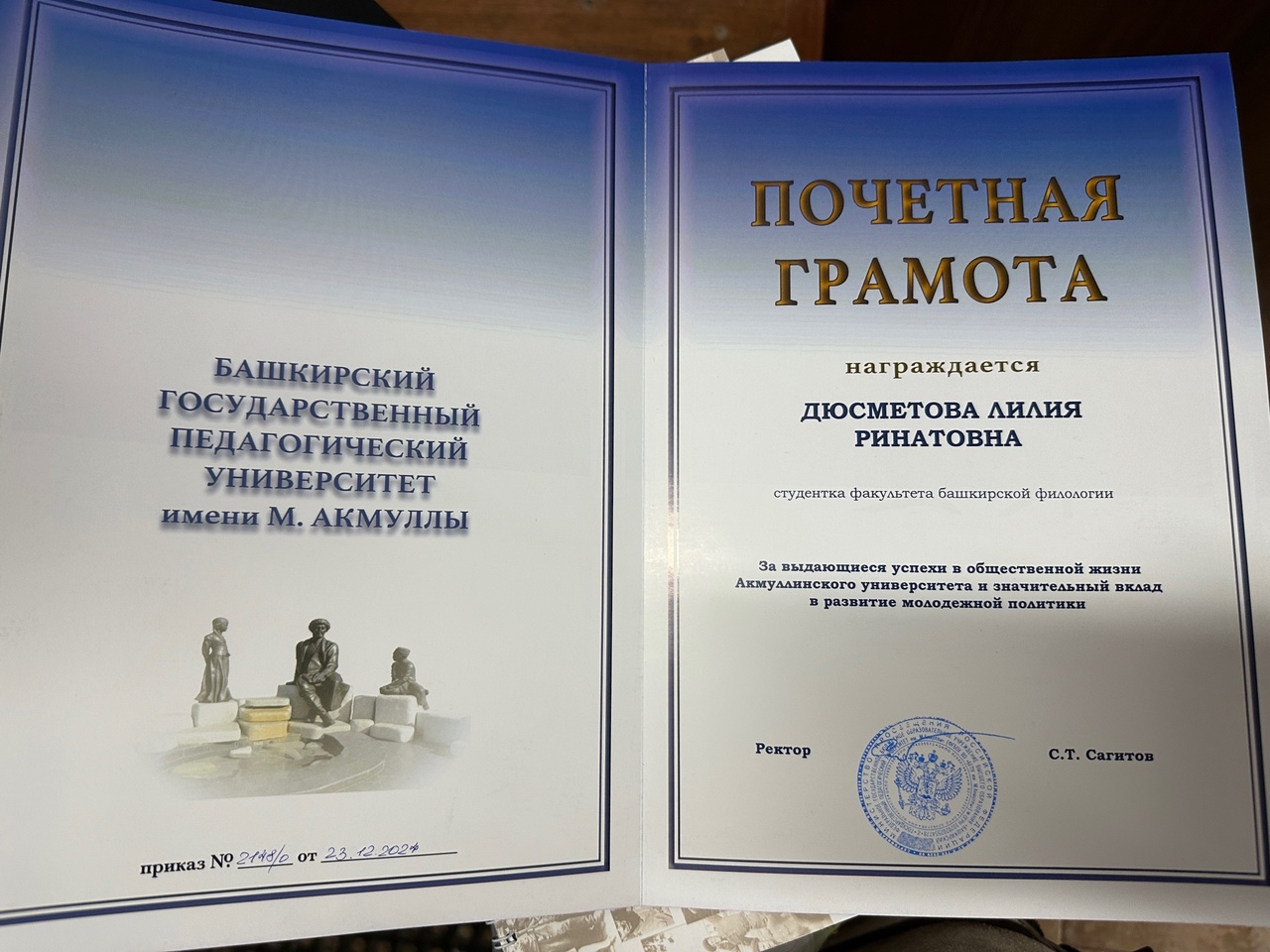 Почетной грамотой Акмуллинского университета за выдающиеся успехи в общественной жизни университета и значительный вклад в развитие молодежной политики награждены: