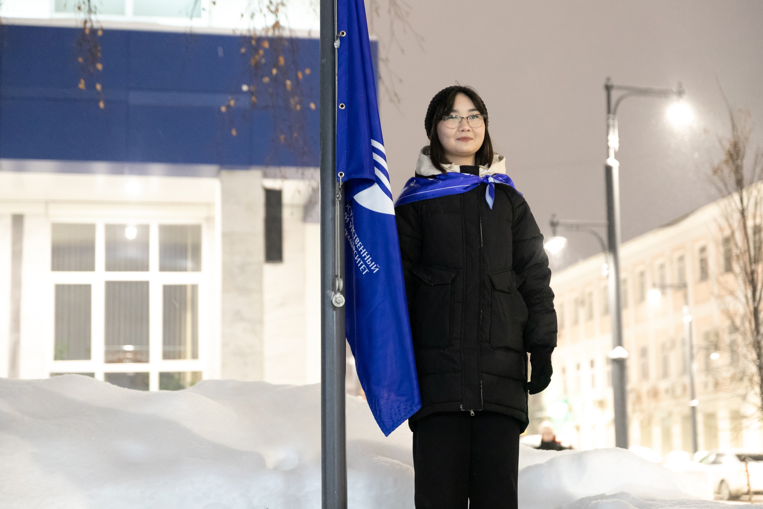 Сегодня почетное право поднять флаги было предоставлено студентам первого курса ФБФ, имеющим особые достижения в научной и учебной деятельности, а также сдавшим зимнюю сессию на «отлично»: