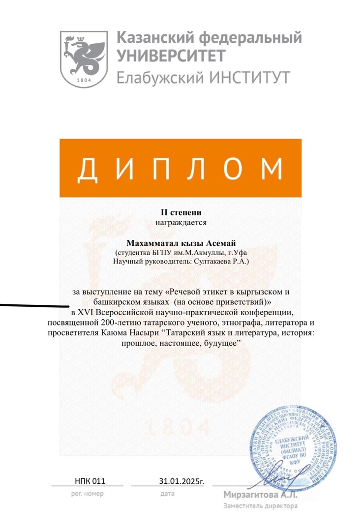 Махамматал кызы Асемай приняла участие в работе конференции и была награждена Дипломом II степени за выступление на тему «Речевой этикет в кыргызском и башкирском языках (на основе приветствий)». Подготовила ее к.филол.наук, доцент кафедры тюркской и восточной филологии факультета башкирской филологии Султакаева Раушания Абдулхаевна!