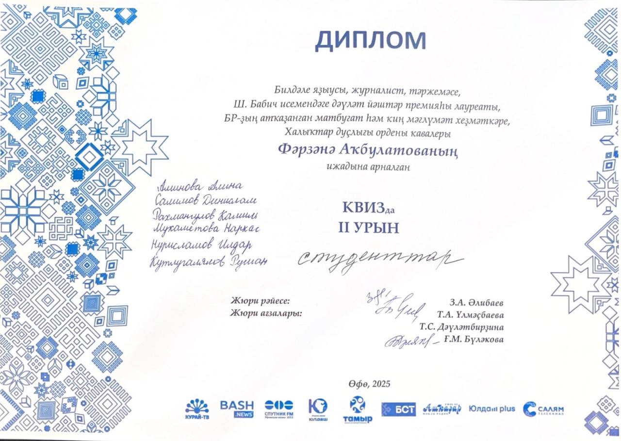 Эрудиция, сообразительность и командный дух наших студентов позволили им занять почетное второе место, что стало заслуженной наградой за их усердие и любовь к башкирской литературе.