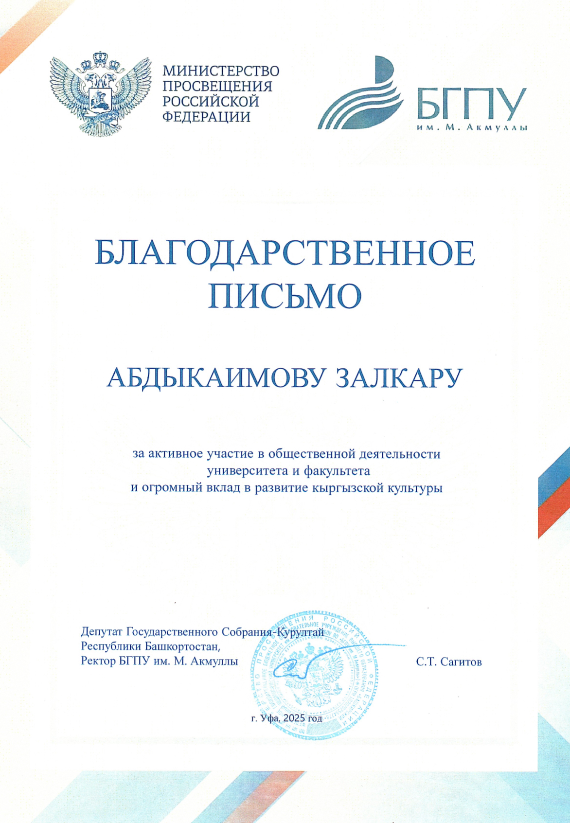 В ходе торжественного мероприятия состоялась церемония награждения. Абдыкаимов Залкар, студент 3 курса, получил из рук ректора БГПУ им. Акмуллы Салавата Талгатовича Сагитова благодарственное письмо за активное участие в общественной деятельности университета и факультета, а также за огромный вклад в развитие кыргызской культуры. Его усилия и преданность делу вдохновляют однокурсников и создают положительный имидж университета.