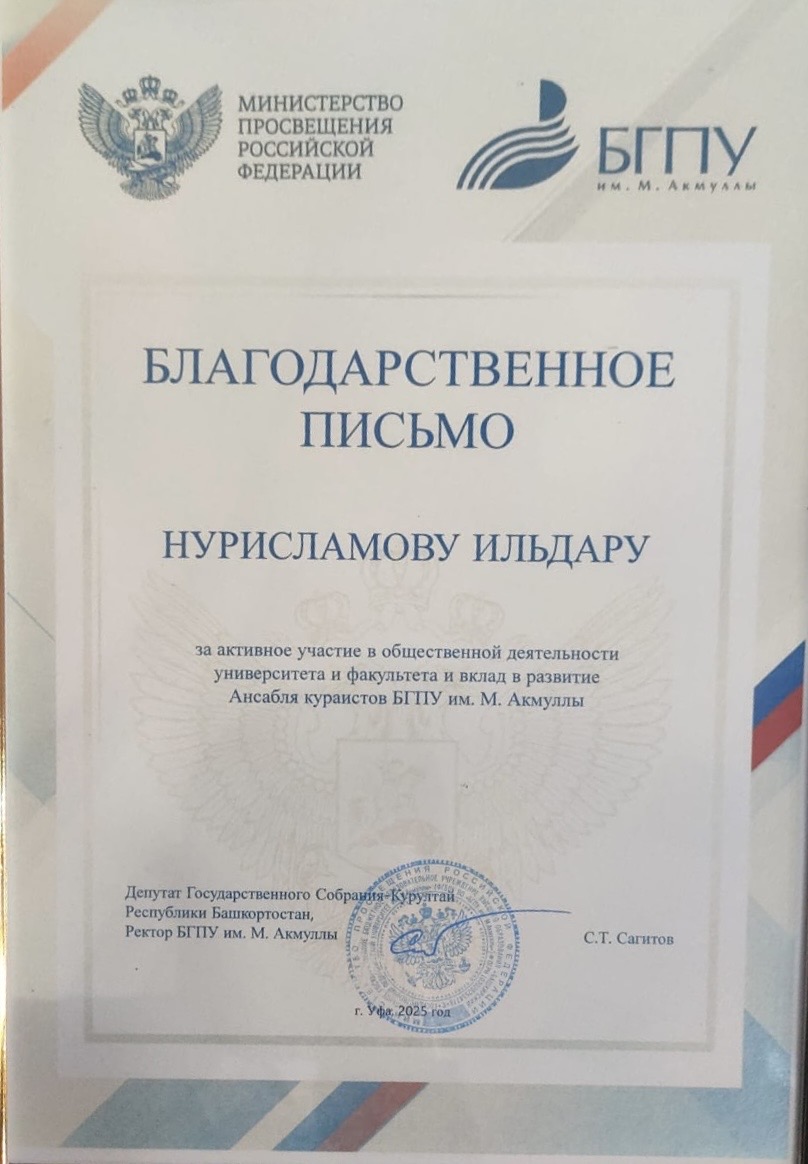 Также благодарственным письмом был удостоен студент 3 курса Нурисламов Ильдар за активное участие в общественной деятельности университета и факультета, а также за вклад в развитие Ансабля кураистов БГПУ им. М. Акмуллы. Его талант и энтузиазм позволяют сохранять и развивать богатые музыкальные традиции, обогащая культурное наследие не только университета, но и всей республики.