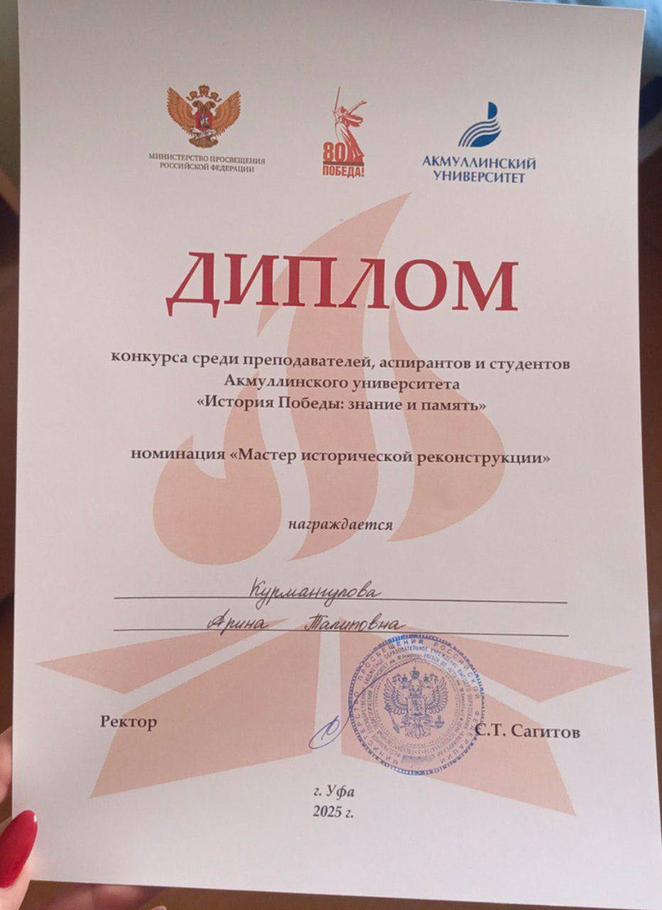 Студентка 3 курса Курмангулова Арина награждена Дипломом в конкурсе «История Победы: знание и память» в Акмуллинском университете