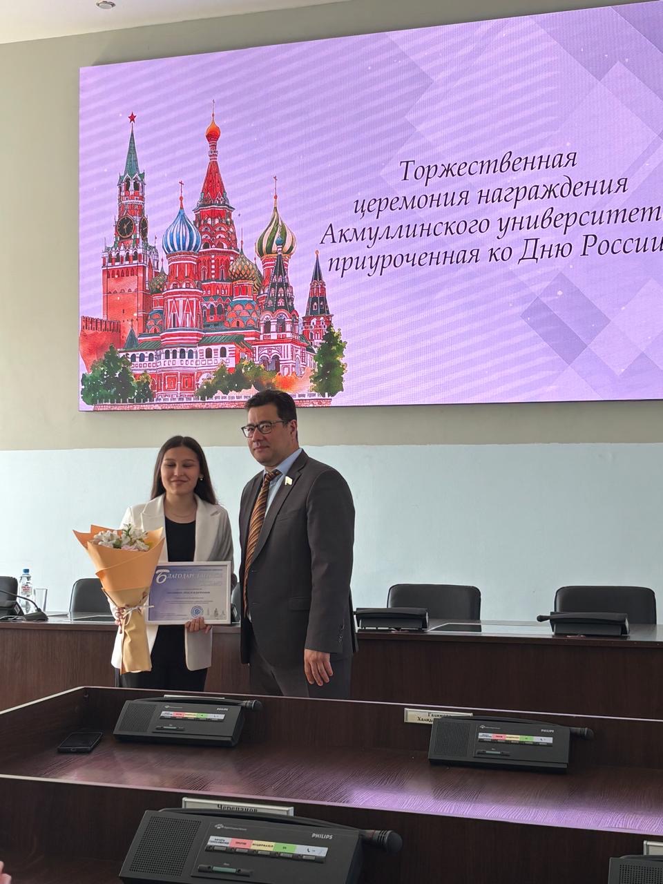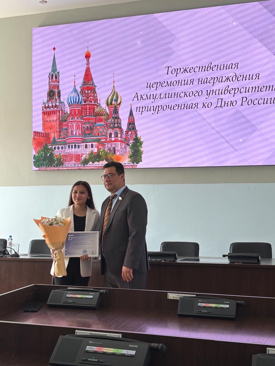 10 июня в Акмуллинском университете состоялось торжественное награждение студентов, внёсших весомый вклад в развитие университетской жизни. Были отмечены инициативные, целеустремлённые молодые люди, проявившие себя в общественной деятельности, поддержке студенческих проектов и формировании современной молодёжной политики.