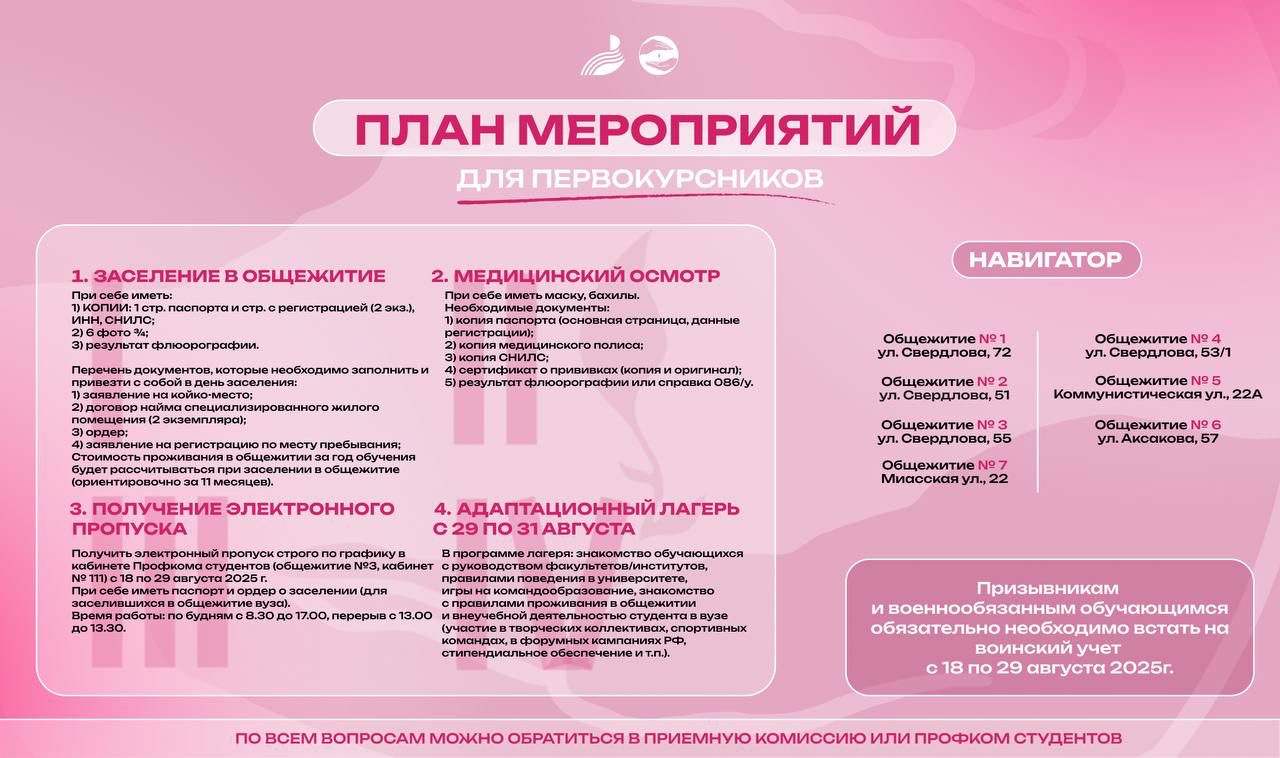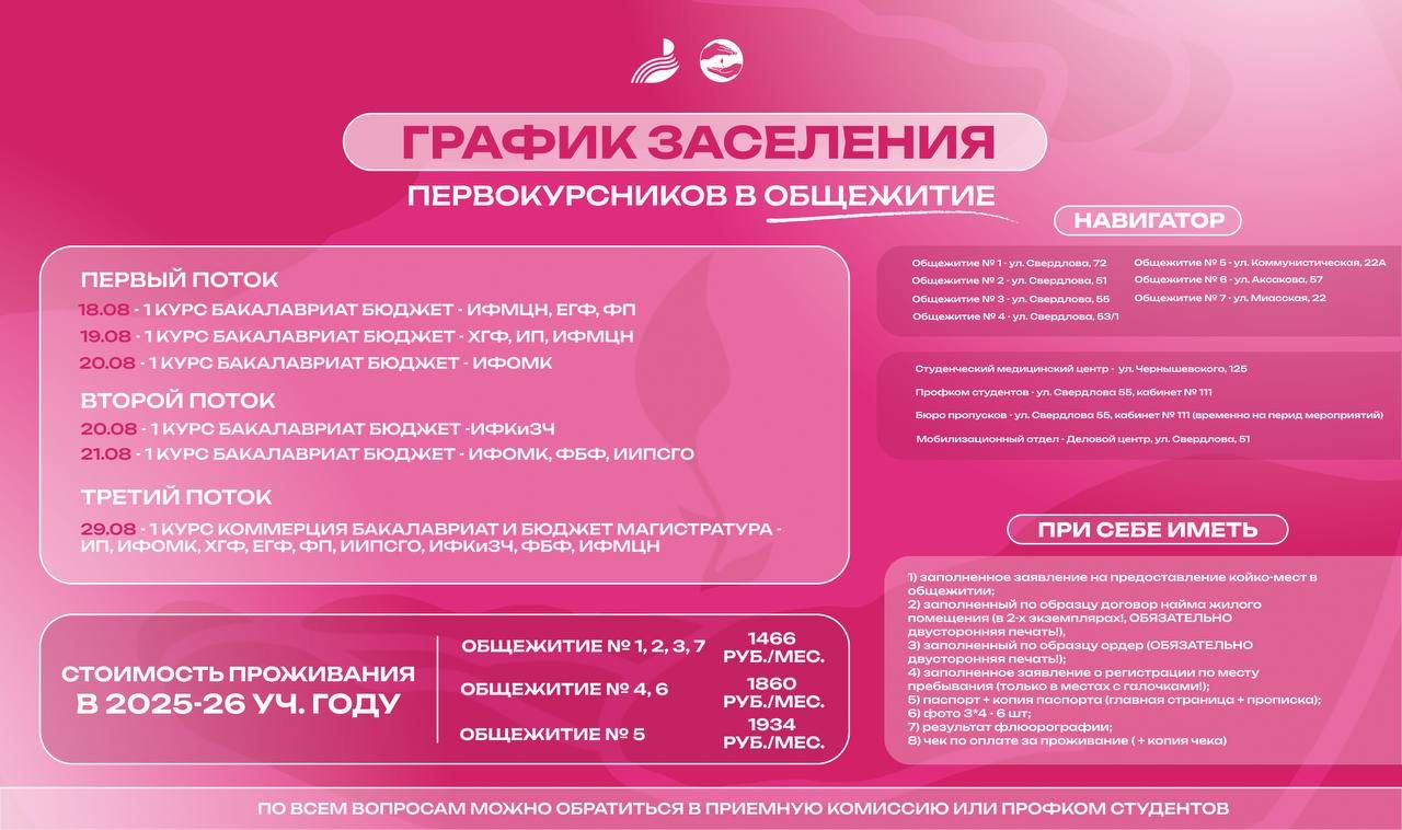Напоминаем, что завтра, 21 августа 2025 года, заселение в общежитие № 6 с 08.30-17.00 (ул. Аксакова, д.57).