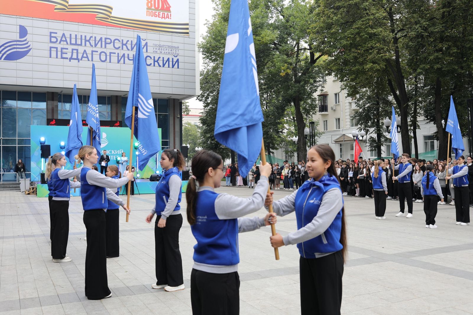 Праздник начался с церемонии поднятия государственных флагов России, Республики Башкортостан, Министерства просвещения РФ, а также флага самого университета. В адрес студентов прозвучали приветственные слова министра просвещения России Сергея Кравцова.