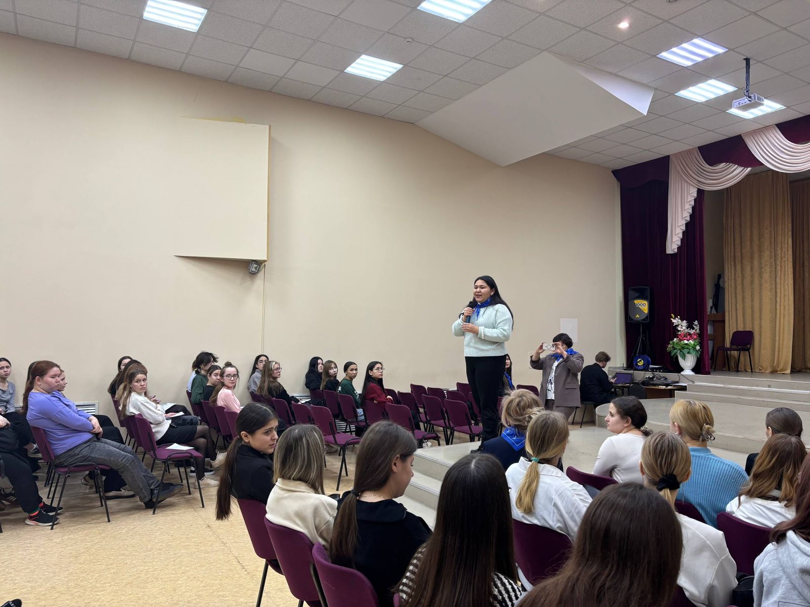Студентка 2 курса и председатель студенческого совета Абдуллина Зульфия поделилась своим личным опытом обучения в университете. Она рассказала как у нее проходит учеба, об особенностях поступления, о кружках и секциях, в которых она участвует, а также о возможностях для самореализации и развития лидерских качеств. Она подчеркнула, что университет создает все условия для активной и насыщенной студенческой жизни, а также для получения качественного образования.