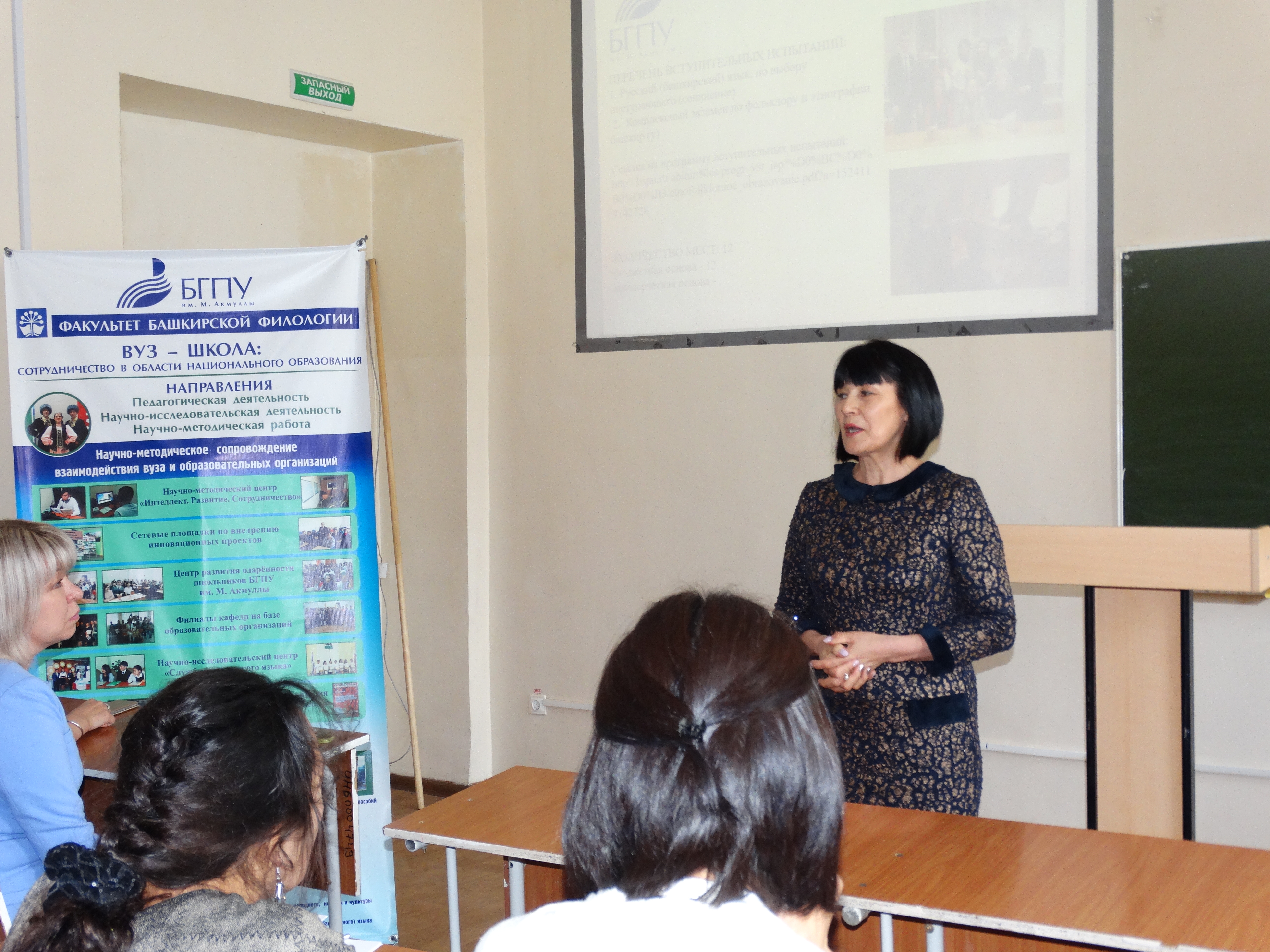 В рамках Дней магистратуры на Факультете башкирской филологии состоялась презентация магистерских программ для выпускников-бакалавров и учителей школ г. Уфы и Республики Башкортостан. На презентации присутствовало около 50 человек, в том числе 7 учителей школ. С приветственным словом выступила декан, д.ф.н., профессор Самситова Луиза Хамзиновна, она презентовала две магистерские программы педагогического образования направленности «Лингвокультурологическое образование» и «Сравнительно-сопоставительное языкознание». Рассказала о том, что  обучение в магистратуре позволяет педагогу овладеть углубленным пониманием профессиональных и практических проблем, развить навыки аналитической, исследовательской, консультативной и научно-педагогической деятельности. Это возможность и мотивация повышать свою квалификацию, эффективный фактор развития личностного и профессионального роста, что должно привести к улучшению качества образования и повышению статуса учителя. Параллельно на второй площадке шла публичная защита этих двух программ д.ф.н., профессором кафедры башкирского языка и методики его преподавания Давлетбаевой Раисой Губайдулловной.