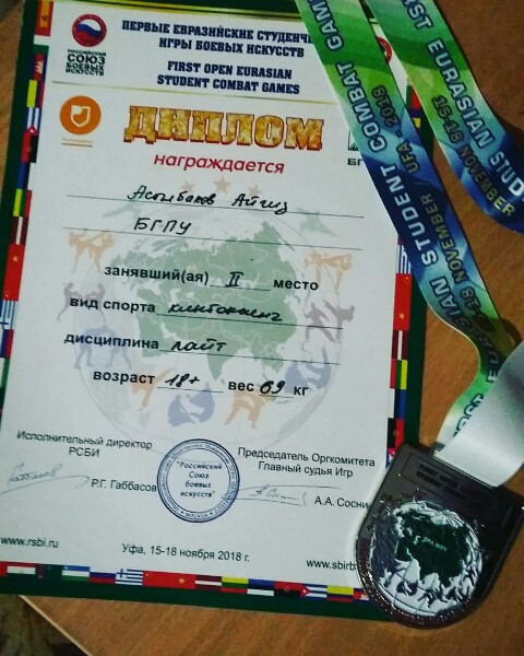 Айгиз Асылбаков, студент II курса факультета башкирской филологии, занял II место по кикбоксингу в весовой категории 69 кг. Поздравляем Айгиза с победой и желаем дальнейших успехов!