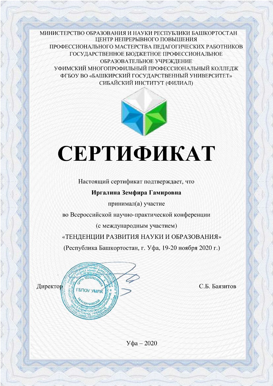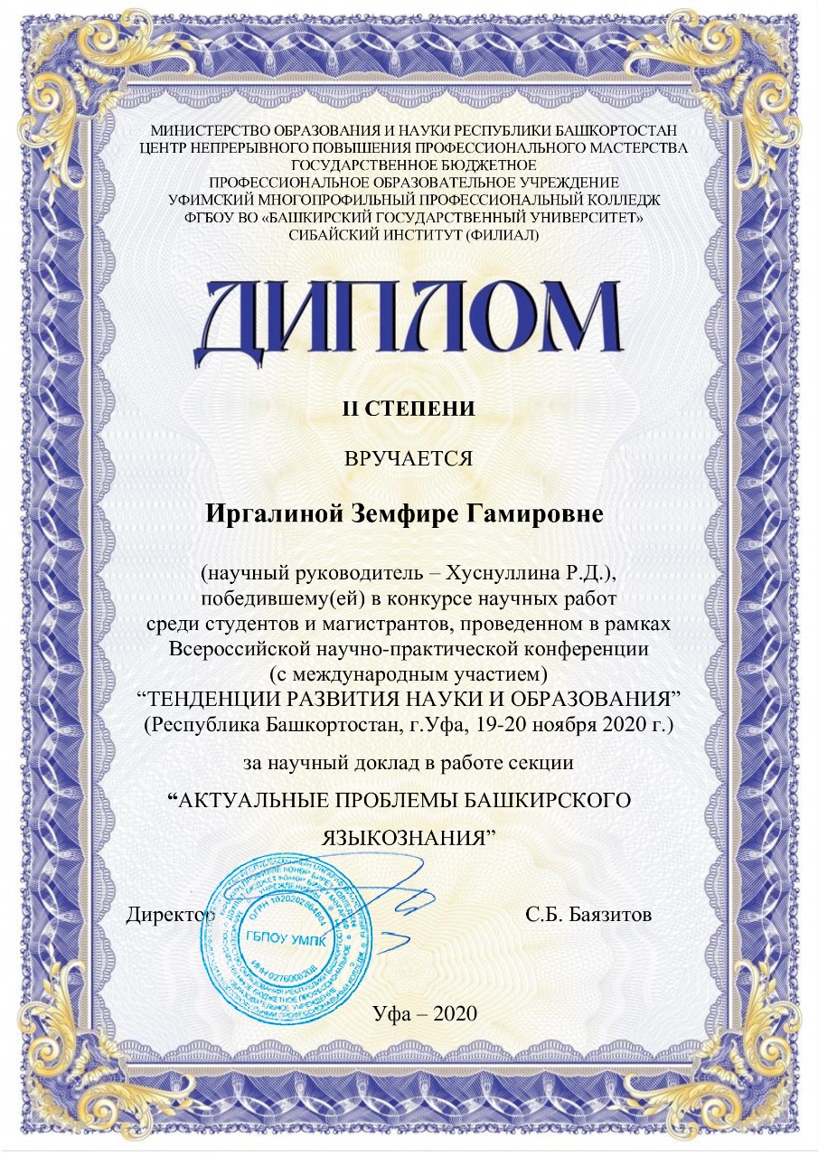 Поздравляем студента  4 курса факультета башкирской филологии Земфиру Иргалину и ее руководителя, доц. Хуснуллину Р.Д. с получением Диплома  2 степени  на конкурсе научно-исследовательских работ среди студентов и магистрантов, проведенного в рамках Всероссийской НПК (с международным участием) «Тенденция развития науки и образования», организованного Министерством образования и науки РБ, Центром непрерывного повышения профессионального мастерства педагогических работников, ГБПОУ УМПК, а также Сибайским институтом БашГУ.