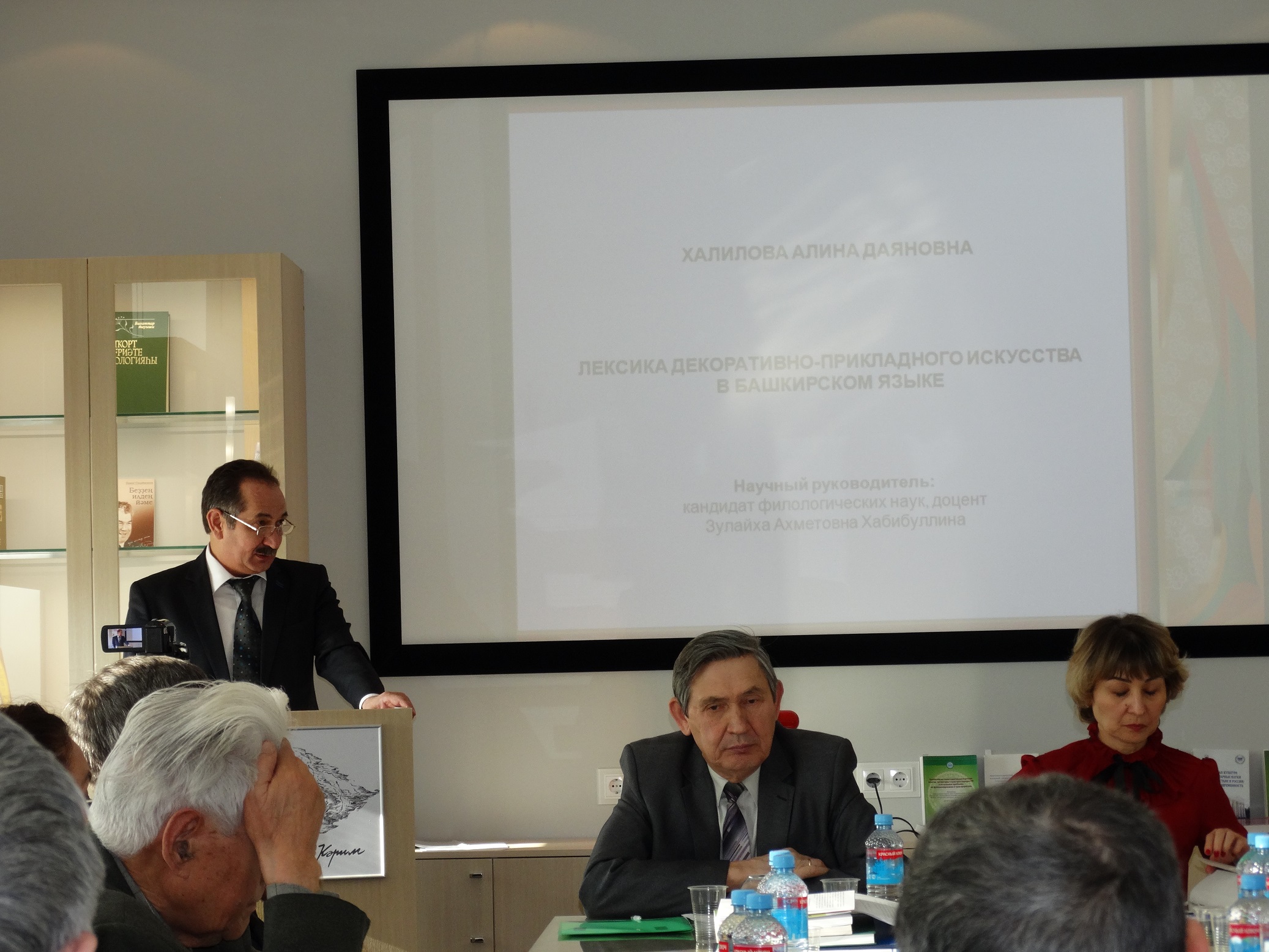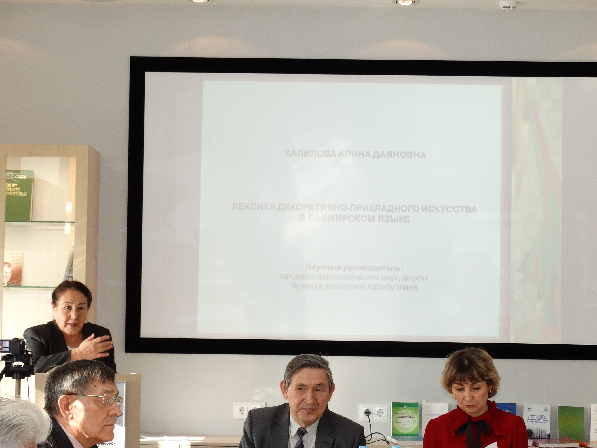 Защита состоялась 16 февраля  в диссертационном совете БашГУ на тему: "Лексика декоративно-прикладного искусства в башкирском языке" по специальности: 10.02.02. - Языки народов РФ (башкирский язык). Научный руководитель: к.ф.н., доцент Хабибуллина З.А.