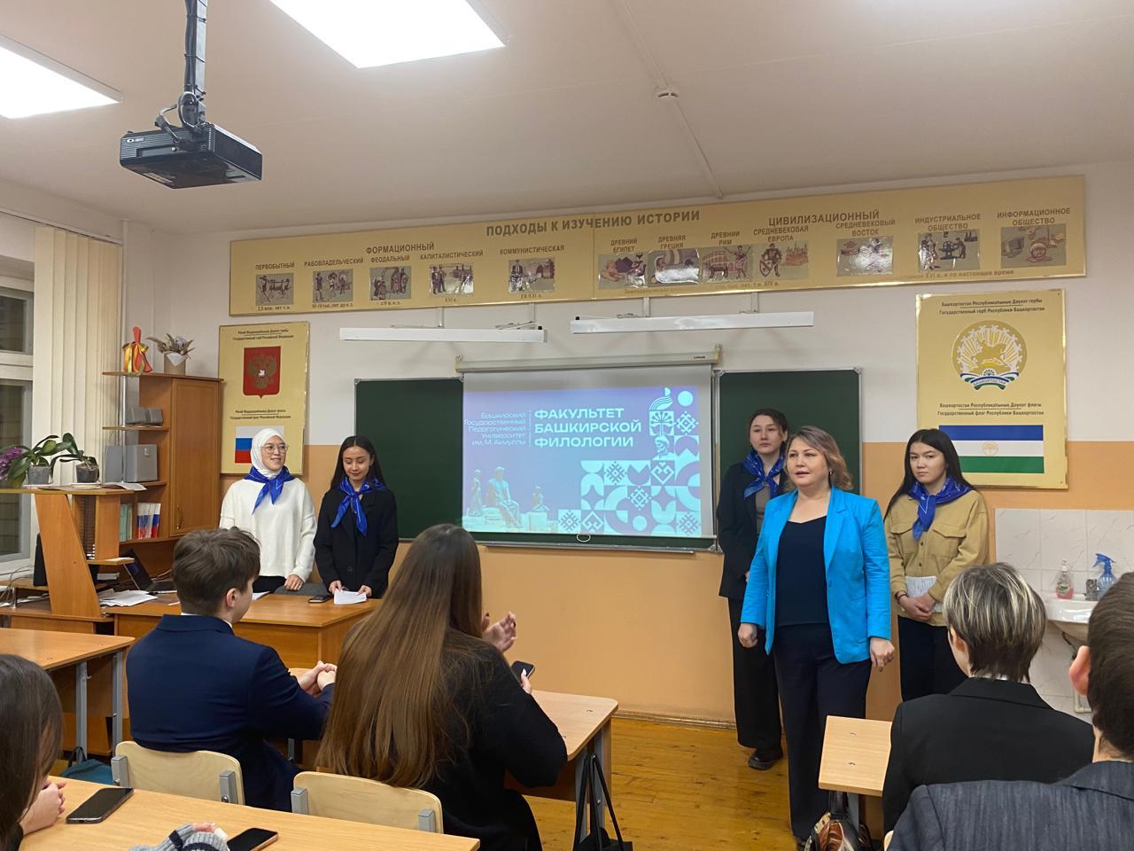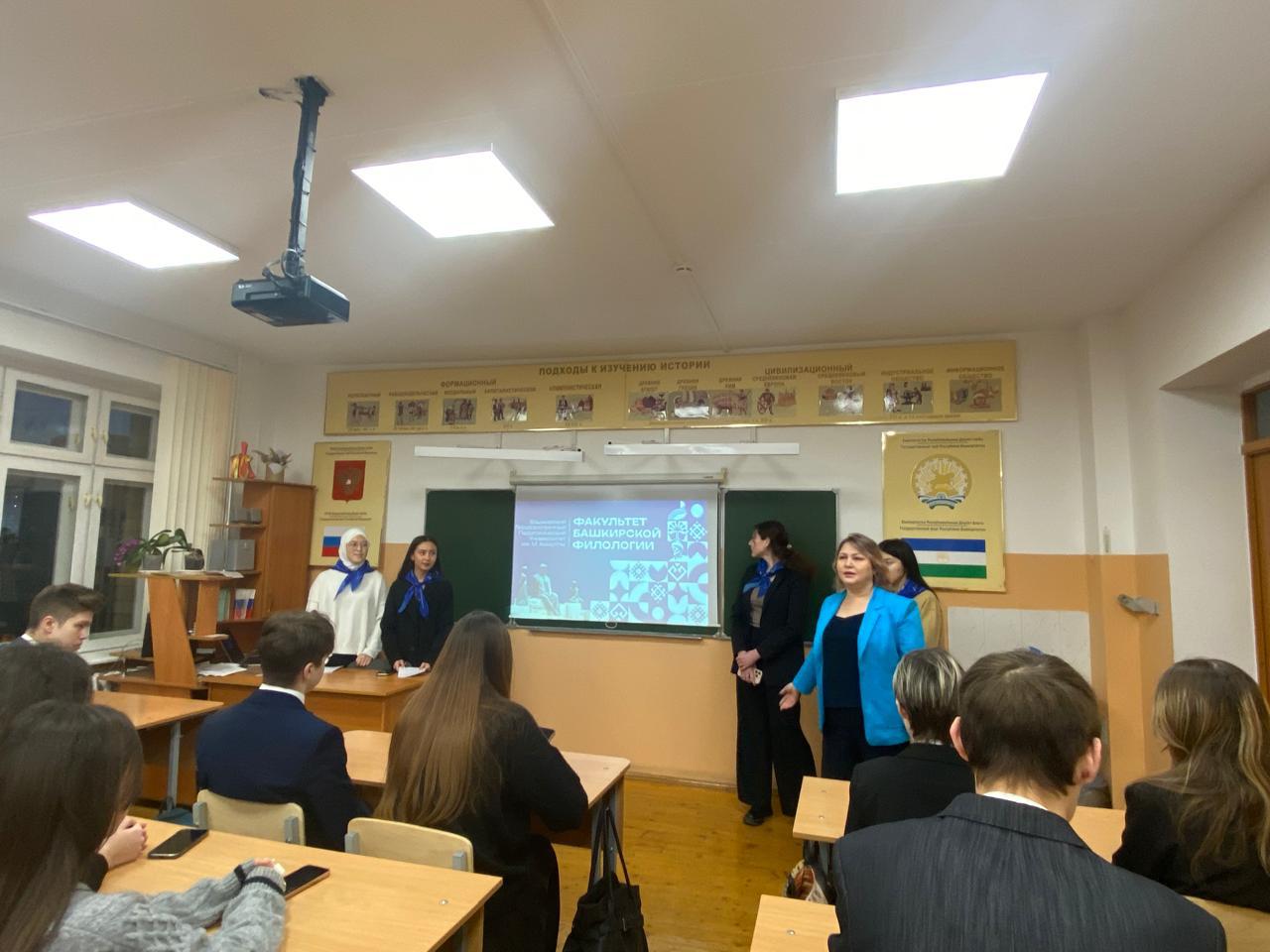 17 ноября  студенты факультета башкирской филологии, обучающиеся по профилю «Родной (башкирский) язык, литература и начальное образование», курсовой руководитель практики, доцент кафедры башкирского языка и литературы Рахимова Э.Ф., провели профориентационное мероприятие для учеников 11 класса Башкирской гимназии № 158 имени Мустая Карима.