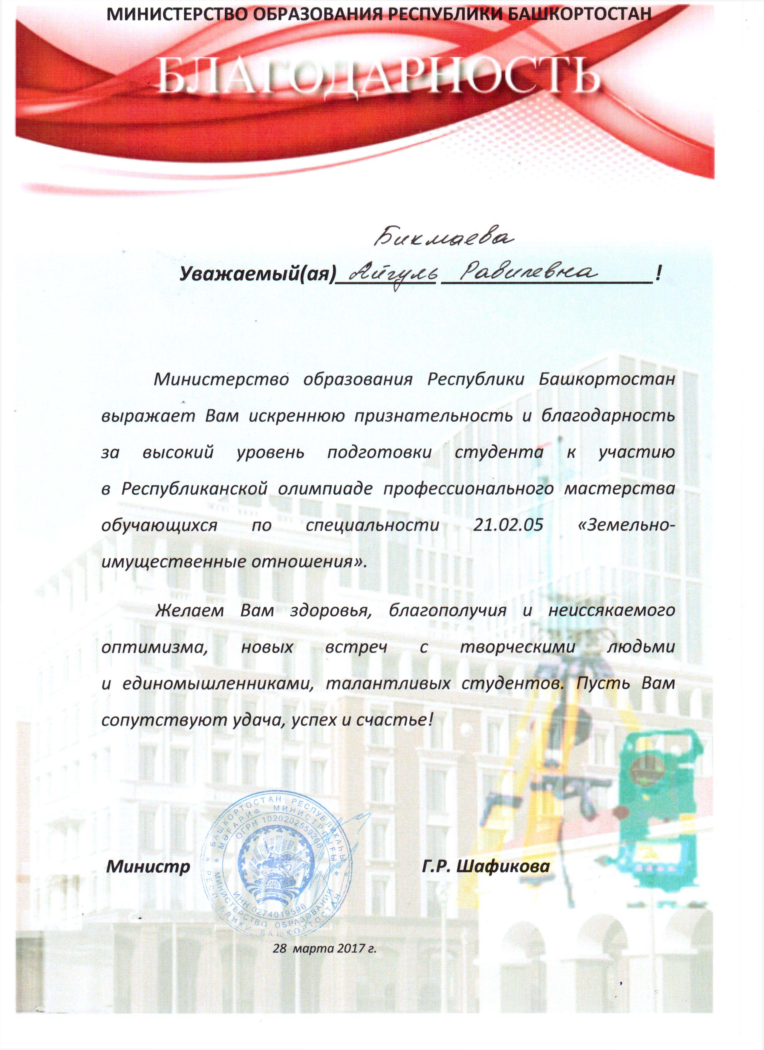 28 марта 2017 года на базе Башкирского колледжа архитектуры, строительства и коммунального хозяйства прошел региональный этап Всероссийской олимпиады профессионального мастерства по УГС 21.00.00 «Прикладная геология, горное дело, нефтегазовое дело и геодезия» (специальности 21.02.05 «Земельно-имущественные отношения», 21.02.06 «Информационные системы обеспечения градостроительной деятельности»).