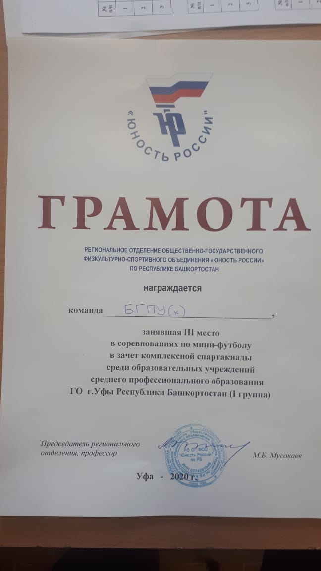 2-7 марта состоялись соревнования по мини-футболу в зачет комплексной спартакиады  среди образовательных учреждений среднего профессионального образования г. Уфы.  Команда Колледжа БГПУ им.М.Акмуллы вышла в финальный раунд соревнований, в котором обыграла команду Уфимского автотранспортного колледжа со счетом 10:0 и команду Уфимского топливно-энергетического колледжа со счетом 4:3, уступив в упорной борьбе лишь студентам Уфимского техникума железнодорожного транспорта со счетом 5:3. По регламенту турнира команда Колледжа БГПУ им.М.Акмуллы заняла третье место. Впереди ждет первенство Республики Башкортостан, в зачет  Комплексной Спартакиады среди обучающихся профессиональных образовательных организаций, которые проводятся в г. Нефтекамск с 23 по 27 марта. Поздравляем, желаем новых успехов!