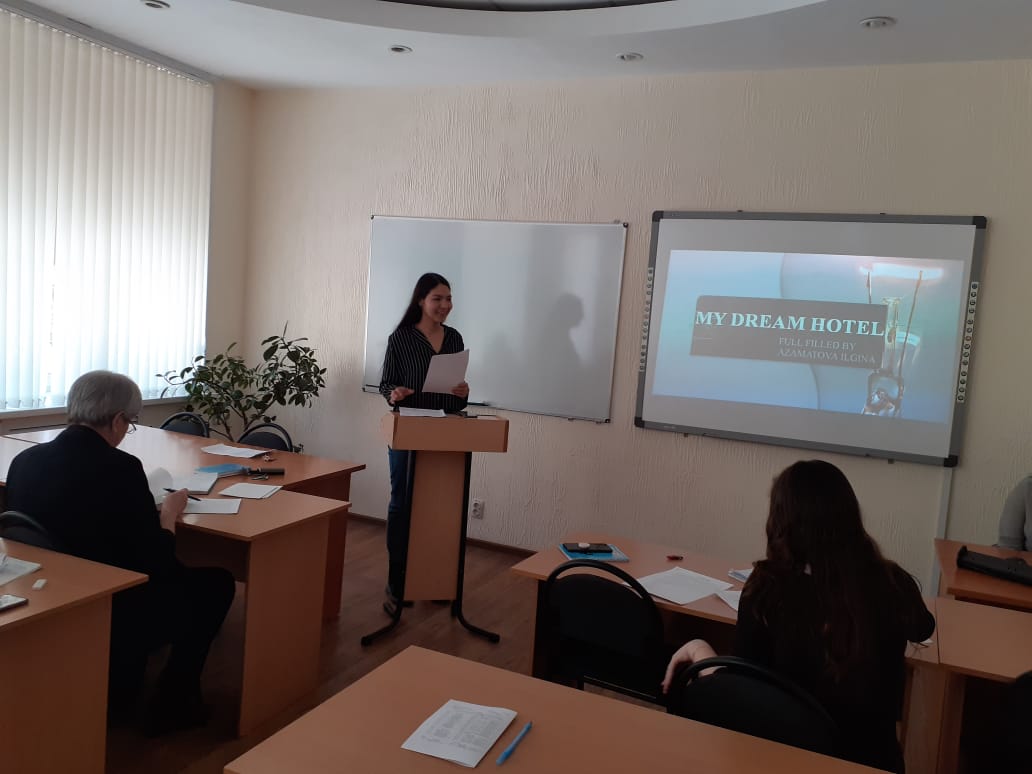 11 марта в рамках декадника цикловой специальности «Гостиничный  сервис» в выпускной  группе 9ГС-31-17(20) прошло открытое мероприятие - защита студенческих проектов «Гостиница будущего» или «Отель моей мечты» на английском языке. Студенты представили различные виды отелей, которые они хотели бы видеть в качестве своих собственных в будущем, начиная от гостиниц в крупнейших городах России - Санкт-Петербурге, Казани, Уфе и такими малыми, как гостиница в деревне Исяново Баймакского района РБ.Творческий подход к этому проекту продемонстрировали Малахова Ирина (гостиница Book House), Баймухаметова Айсылу (гостиница для семейного отдыха Gardaland Majectic).  Студенты сами оценивали себя, заполняя Control Cands и отвечая на вопросы одногруппников и преподавателя Хабибуллиной С.И. Лучшими стали  Азаматова Ильгина, Сахибгареева Рита, Хабибуллина Рита.