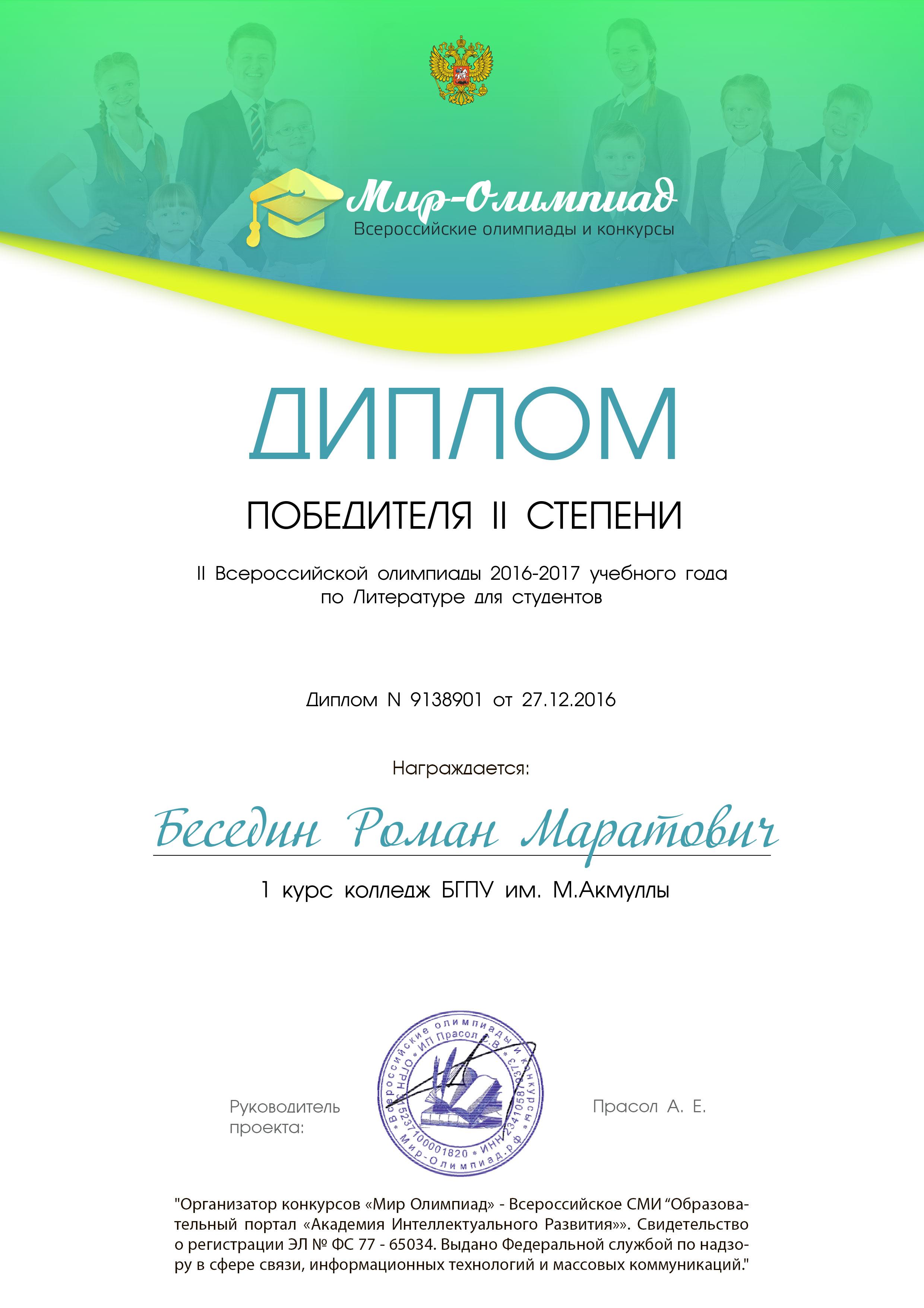 II Всероссийская олимпиада 2016-2017 учебного года по литературе для студентов на сайте «Мир Олимпиад»:  диплом II степени - Беседин Р., Карпова Л. (гр.9Т-11), Лотакова Наталья, Заманова Г. , Хайруллина И., Зинатуллина А., Харисова К., Елисеева А., Габидуллина А., Хайбрахманова Р.(гр.9Э-11).