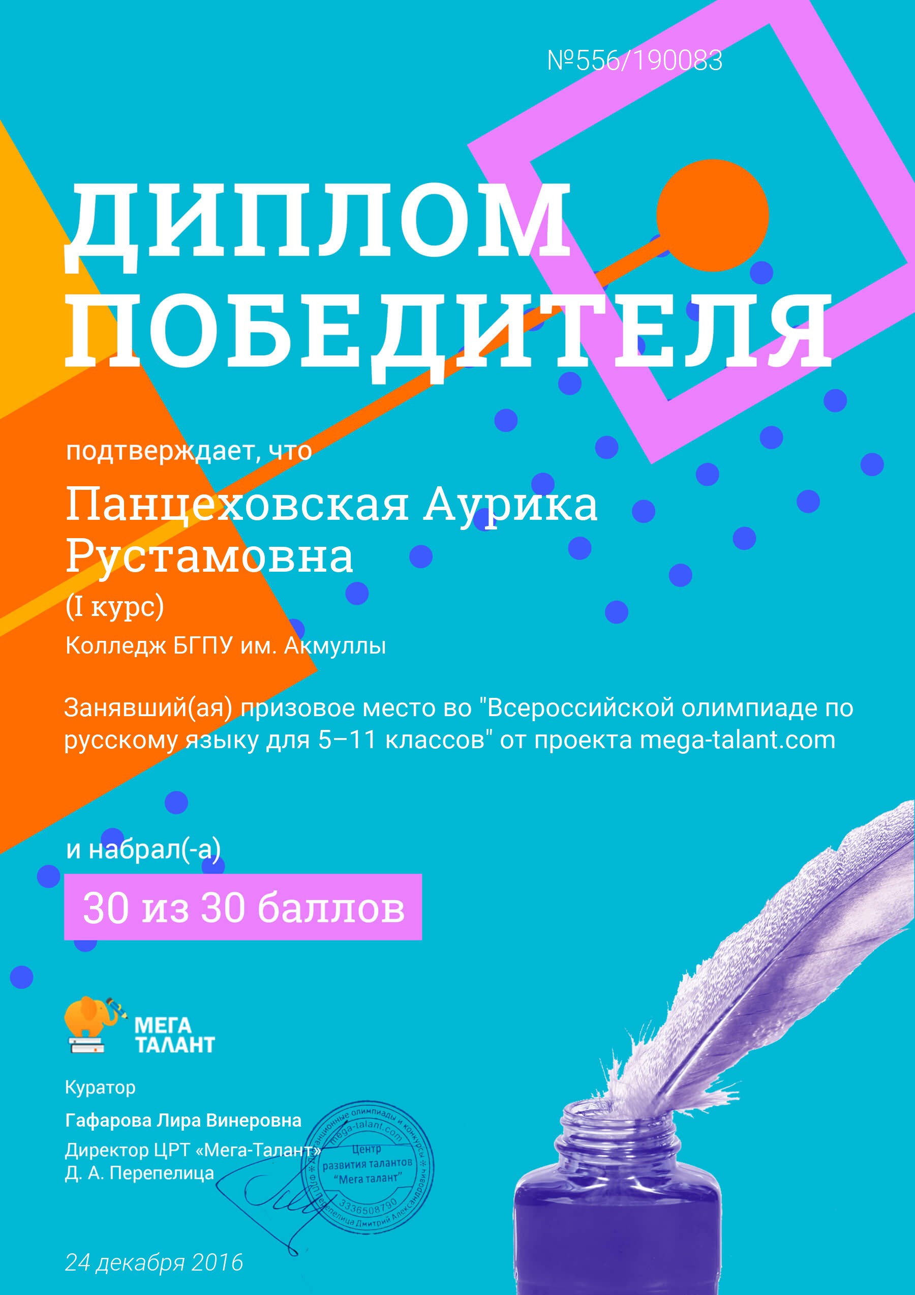 Всероссийская Олимпиада по Русскому языку для студентов от проекта mega-talant.com: диплом I степени - Абдулов И.(гр.9Т-11).