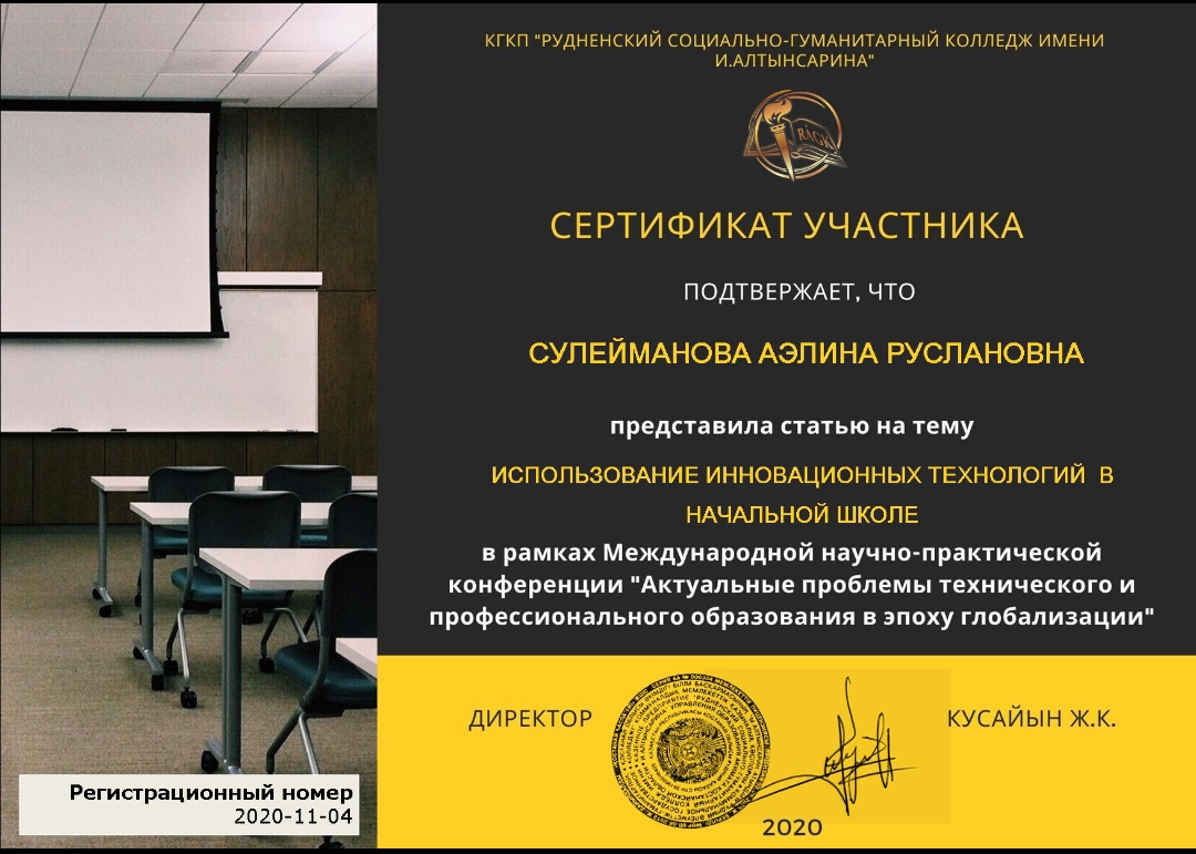 В октябре 2020 года состоялась Международная научно-практическая конференция «Актуальные проблемы развития профессионального образования в эпоху глобализации: история, опыт, практика», посвященная 80-летию КГКП «Рудненский социально-гуманитарный колледж им. И.Алтынсарина».  Целью конференции было:  исследование богатого духовного наследия основоположников  казахской педагогики, диссеминация педагогического опыта использования инновационных методов обучения молодежи на основе национальных ценностей, а  также обсуждение основных проблем подготовки конкурентноспособного специалиста.  Студенты специальности «Преподавание в начальных классах»  Колледжа БГПУ им. М.Акмуллы и их научные руководители, а также преподаватель башкирского языка Бускунова А.А. представили статьи, которые были включены в сборник конференции: Шишкина Яна (группа 9ПНК-11, преподаватель  Уелданова Н.А.)  - «Роль развивающих игр на уроках русского языка»; Сулейманова Аэлина (группа 9ПНК-31, преподаватель Низамова Р.Р.) - «Использование инновационных технологий в начальной школе»; Бускунова А.А. – «Инновации при изучении башкирского языка в Республике Башкортостан». Желаем им дальнейших  успехов в научной деятельности.