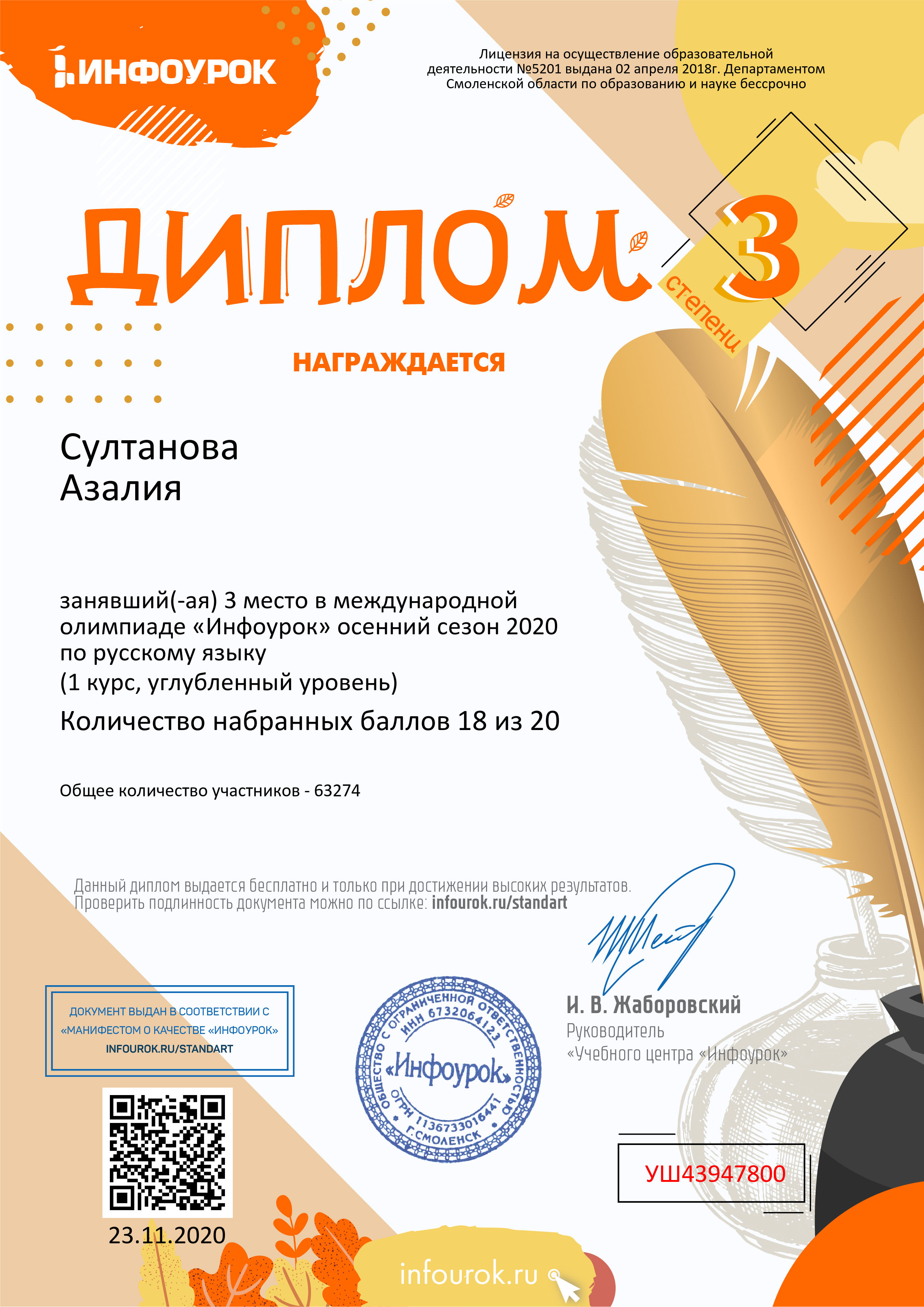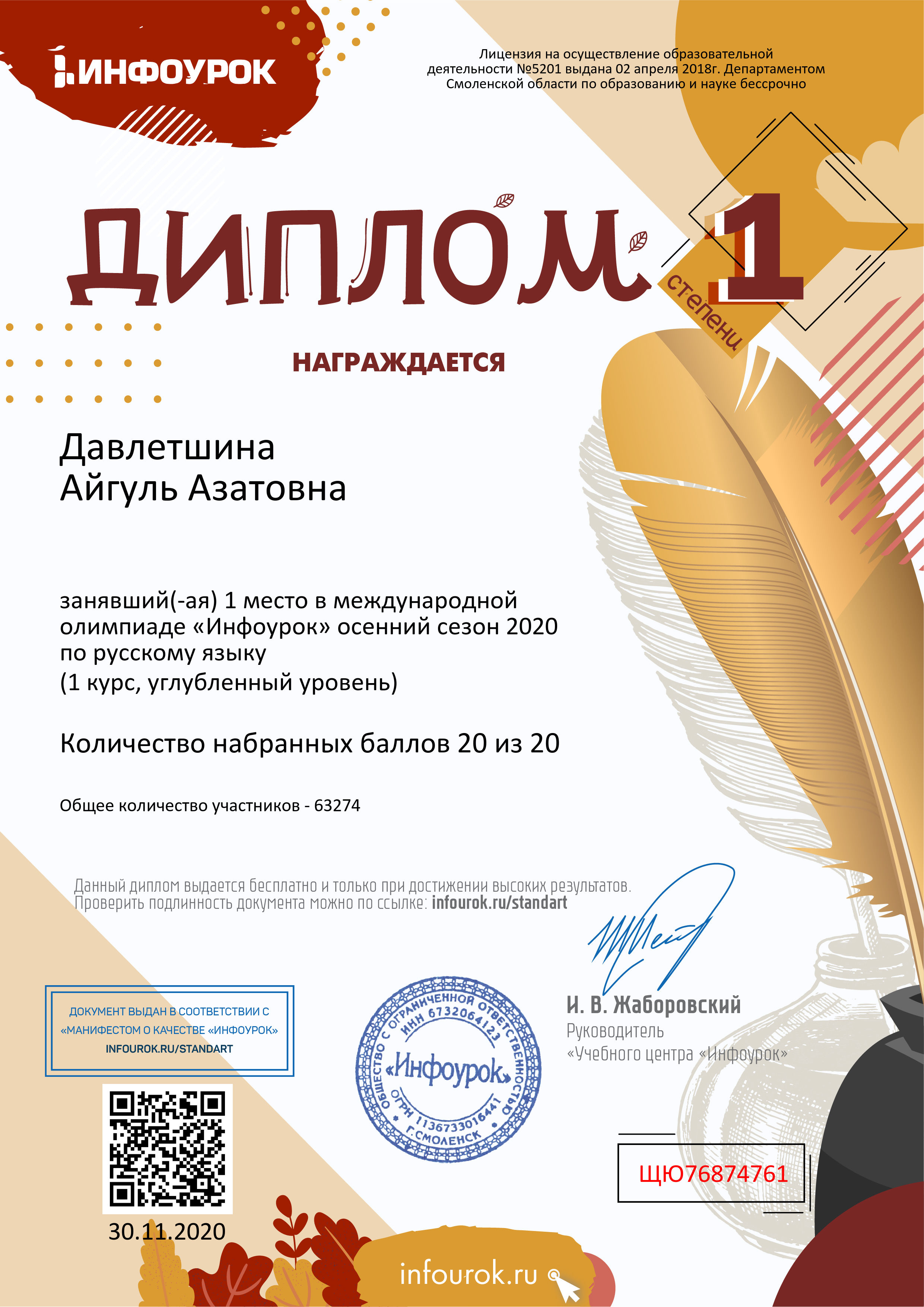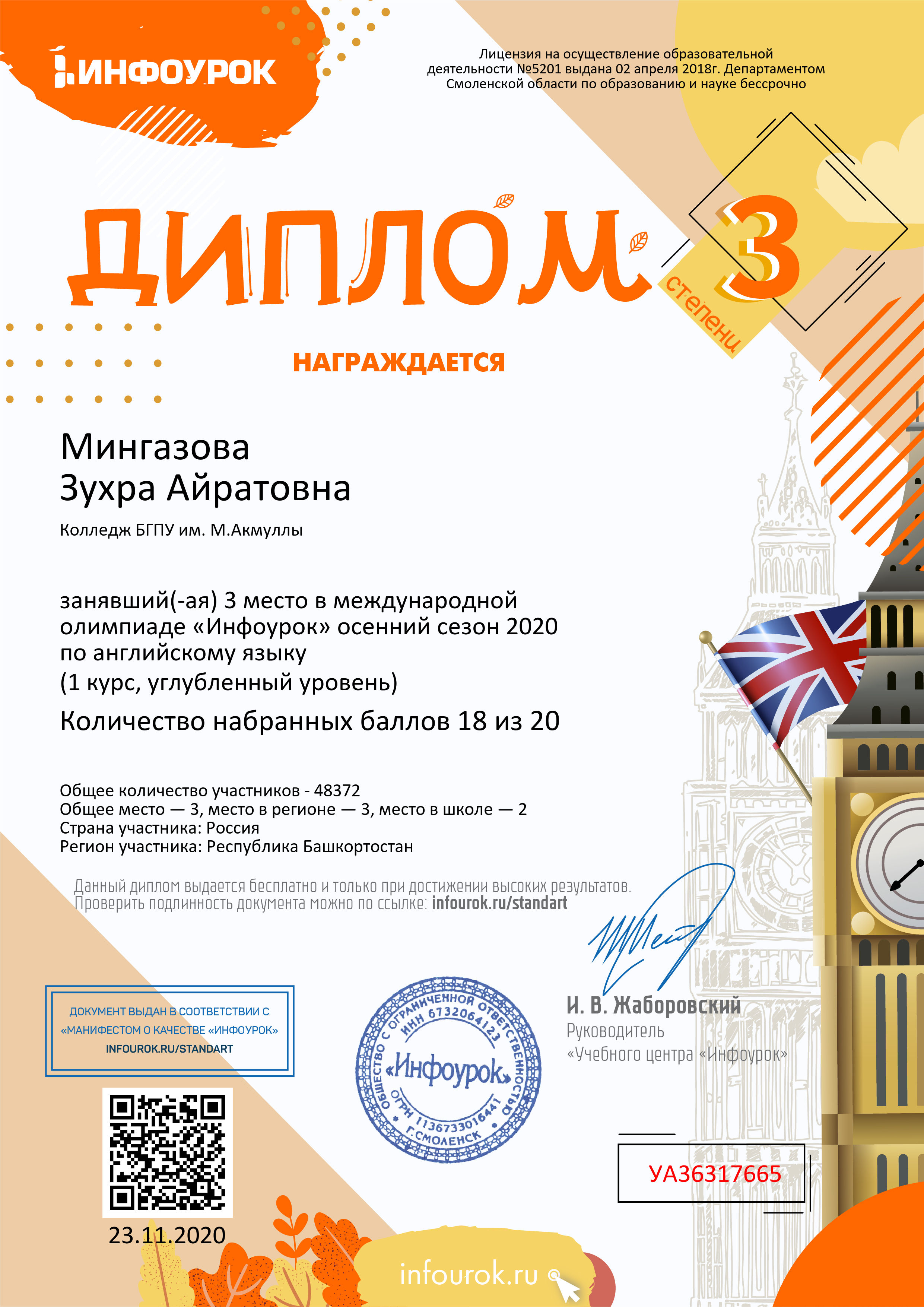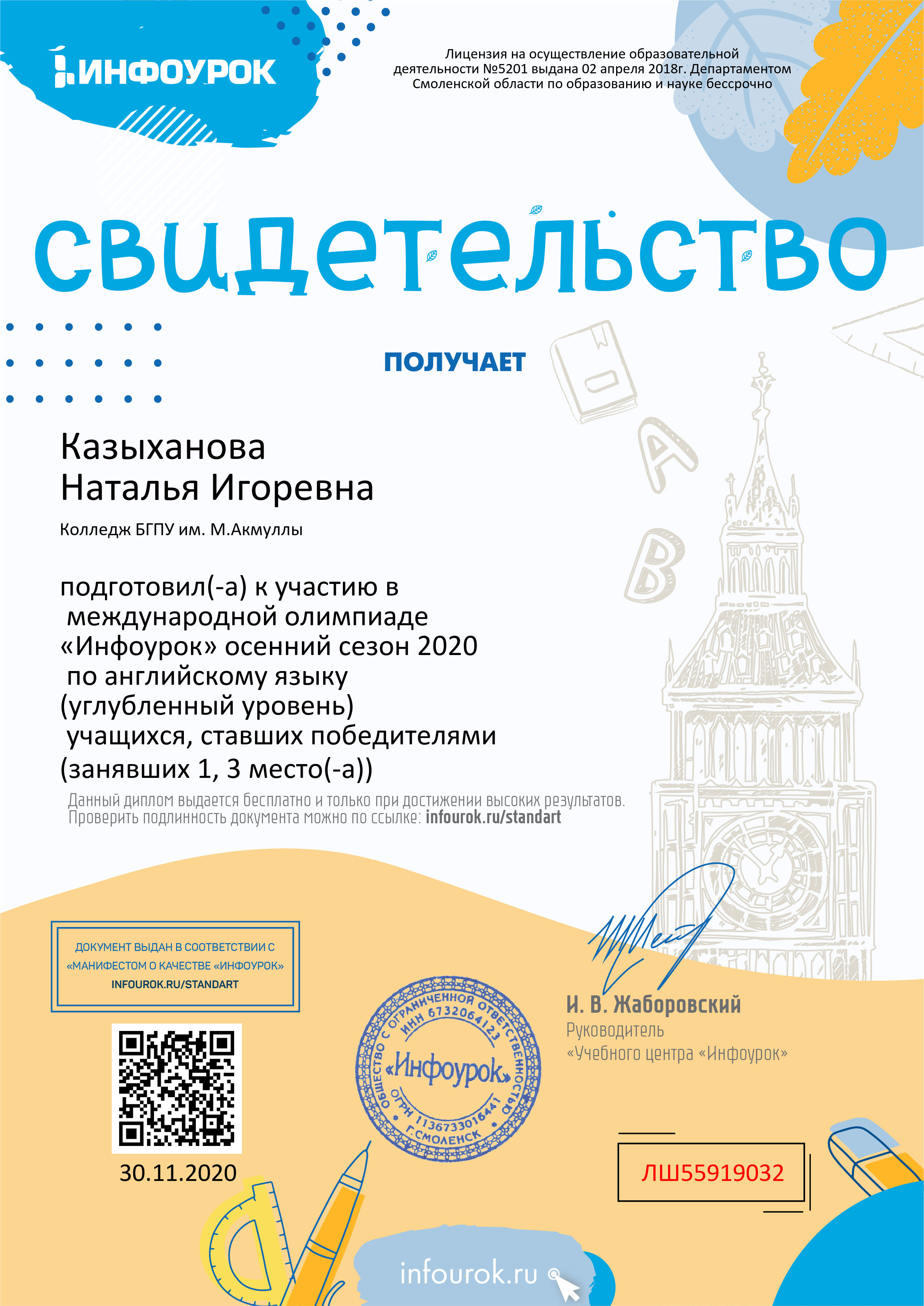 В ноябре 2020 года студенты Колледжа БГПУ им. М.Акмуллы приняли участие в бесплатной Международной олимпиаде «Инфоурок» по русскому и английскому языку. Олимпиада включала в себя задания углубленного уровня. Поздравляем студентов первого курса специальности «Туризм» (группа 9Т-11-20(23)), занявших призовые места, а также преподавателя английского языка Казыханову Н.И., преподавателя русского языка и литературы Гафарову Л.В.