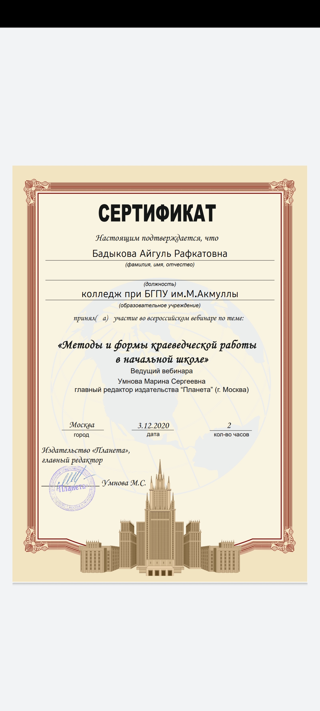 3 декабря 2020 г состоялся  вебинар  «Методы и формы краеведческой работы в начальной школе». Ведущий вебинара: Умнова Марина Сергеевна, главный редактор издательства «Планета». Мероприятие было организовано для учителей начальных классов, педагогов дополнительного образования, методистов. Студенты  специальности «Преподавание в начальных классах»  (групп 9ПНК-11, 9ПНК-12, 9ПНК-21, 9ПНК-31) Колледжа БГПУ им. М.Акмуллы  приняли участие в вебинаре и получили сертификаты.
