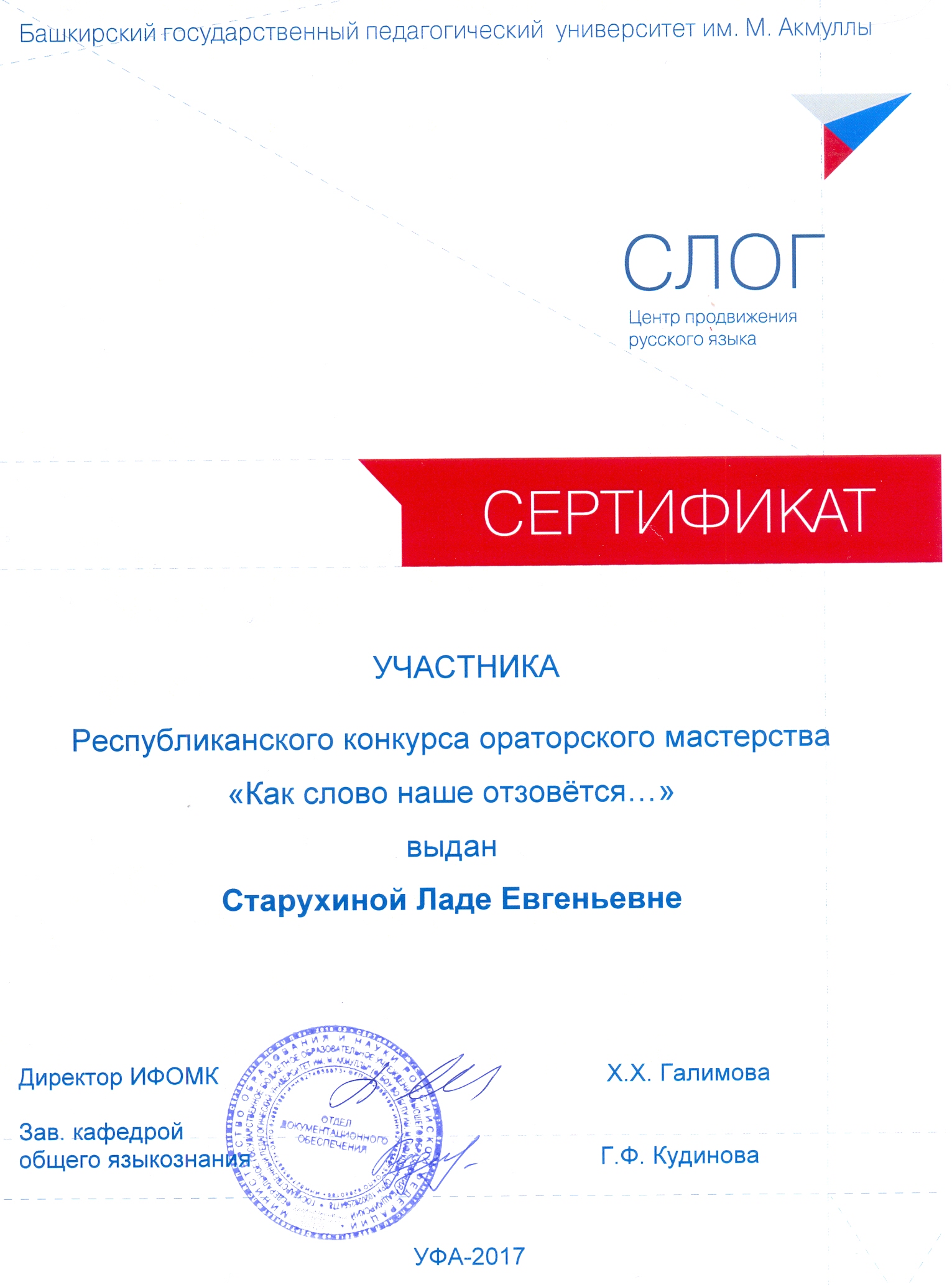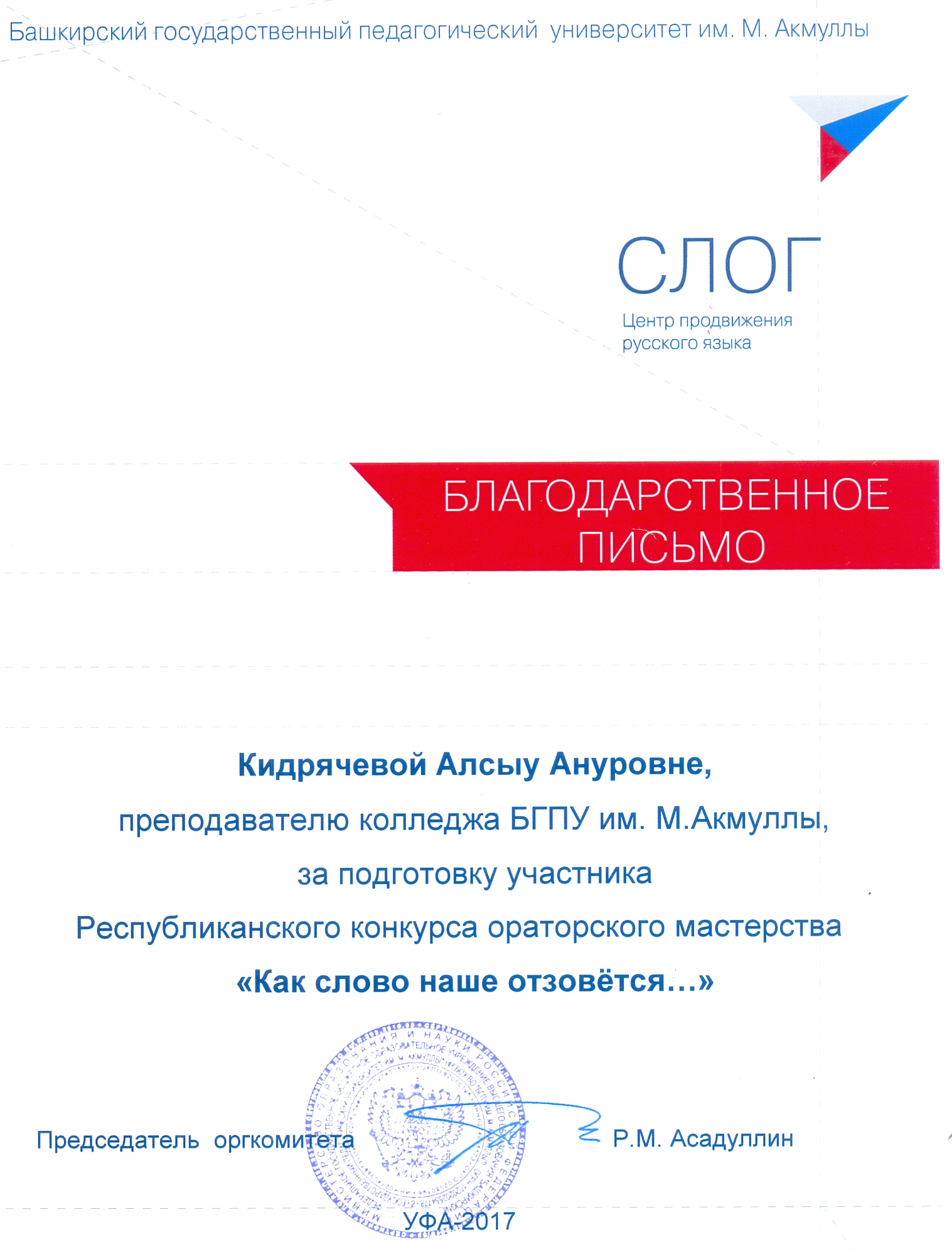 В апреле 2017 года БГПУ им.М.Акмуллы прошел Республиканский конкурс ораторского мастерства "Как слово наше отзовется...". Конкурс проводился в два этапа. Первый этап -  отборочный тур, где организаторы конкурса оценивают видеоролик с речью участника на выбранную тему.  Студентка группы 9ЗИО-11 Лада Старухина (руководитель  А.А.Кидрячева) выбрала тему "Книга,которая оставила след в моей душе" и рассказала о  прочитанной книге известного польского автора Януша Корчака "Король Матиуш Первый", за что была награждена Сертификатом участника, а руководитель Благодарственным письмом за подготовку студента к конкурсу.